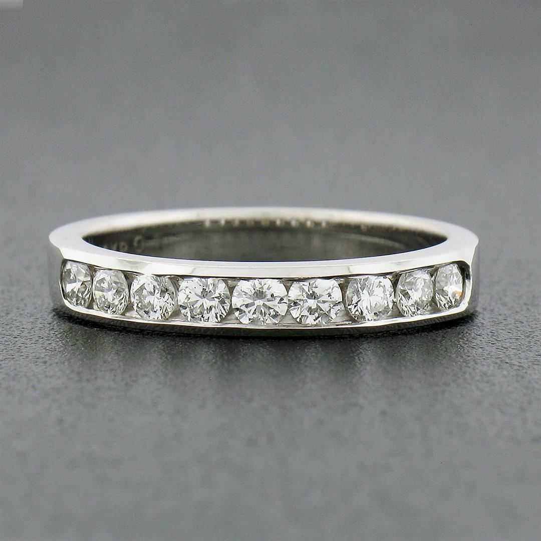 A solid 18k white gold band ring, with 9 round brilliant cut natural diamonds (E/F - VVS2/VS1 ; 0.54ctw). The ring is size 7.0, weighs a total of 3.46 grams, and measures 3.3mm wide.
