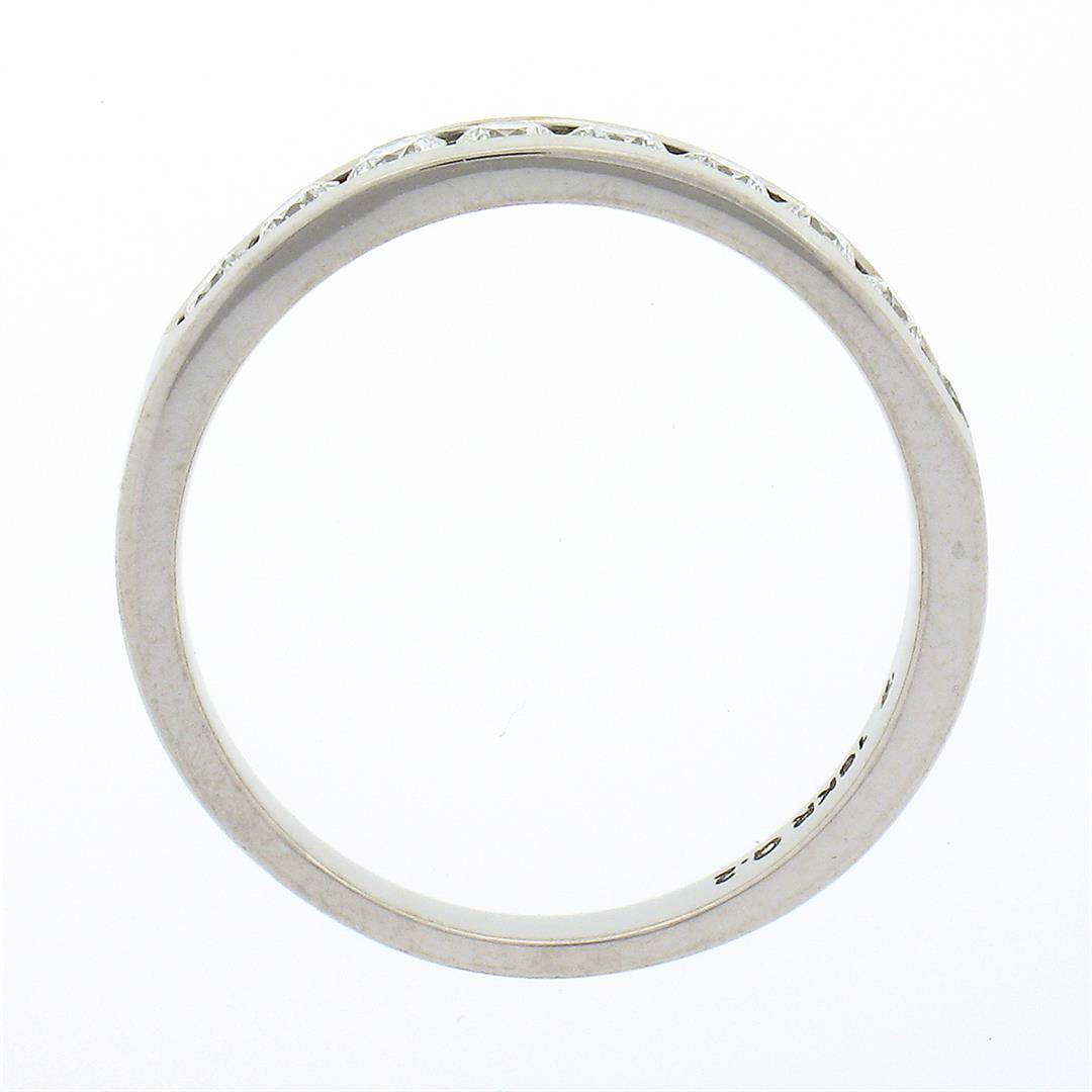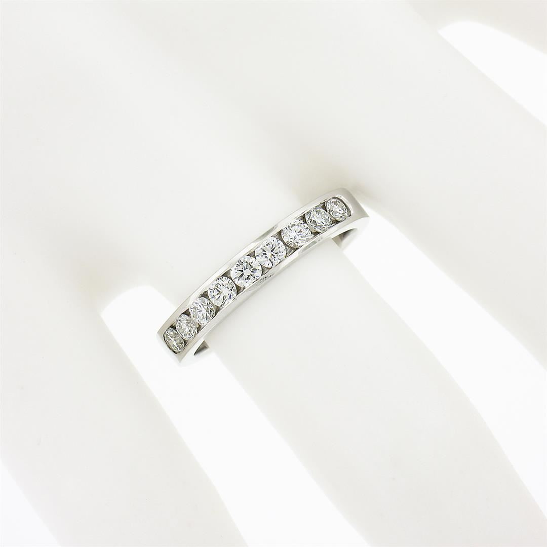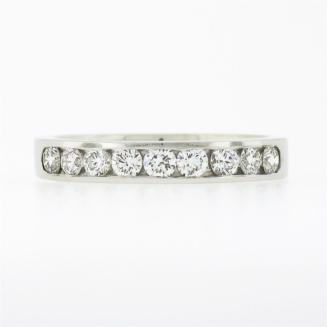 A solid 18k white gold band ring, with 9 round brilliant cut natural diamonds (E/F - VVS2/VS1 ; 0.54ctw). The ring is size 7.0, weighs a total of 3.46 grams, and measures 3.3mm wide.