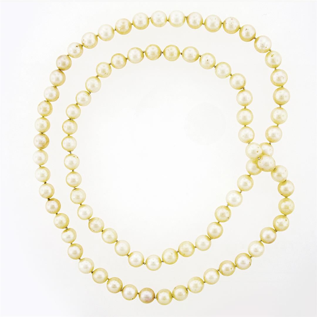 A single strand necklace, with 84 round shape cultured pearls (8mm to 8.5mm each). 30 inch slip on bead strand link chain, 70.93grams total weight.