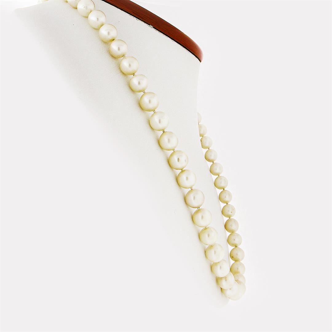 A single strand necklace, with 84 round shape cultured pearls (8mm to 8.5mm each). 30 inch slip on bead strand link chain, 70.93grams total weight.