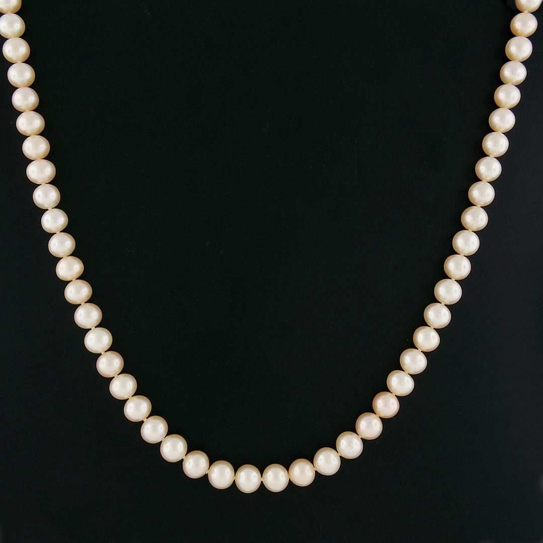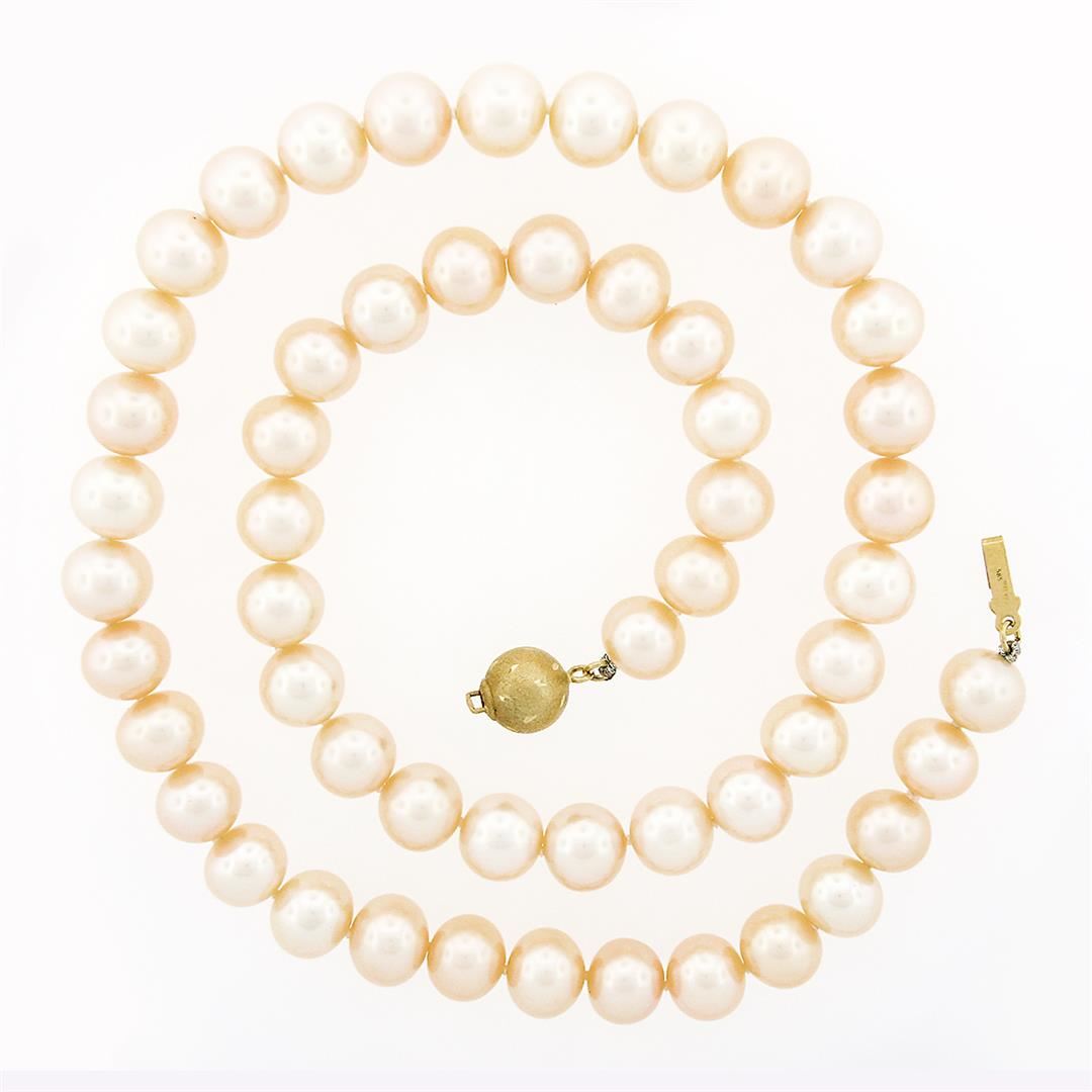 A strand necklace with 14k yellow gold clasp, with 54 round shape cultured pearls (8.0mm to 8.5mm each). 17.5 inch strand link chain, 40.69 grams total weight, clasp thickness measures 8.0mm.