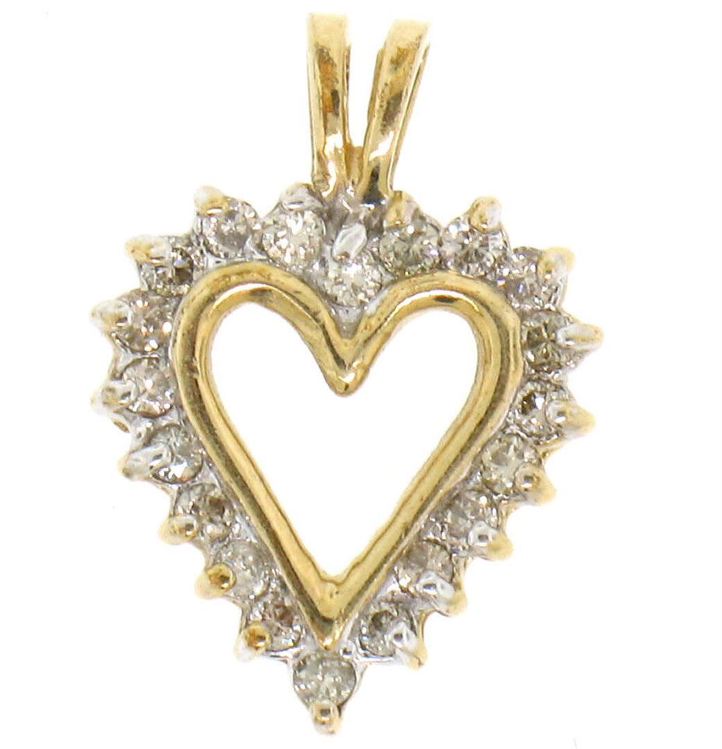 Classic Petite 10K Yellow Gold 0.46ctw Diamond Framed Open Heart Charm Pendant. Please see photos and description for all available information. An estate solid 10k yellow gold heart pendant, with 21 round brilliant cut natural diamonds (SI1; 0.46ctw). The pendant weighs a total of 1.1 grams, measures 17.36x12.27mm including the bail.