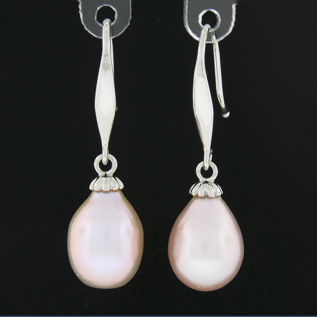 A solid 14k white gold drop dangle earrings, with 2 teardrop shape cultured pearls ( 8.7x11.3mm each). The earrings measure approximately 30.2x2.5mm and weigh a total of 3.10 grams.