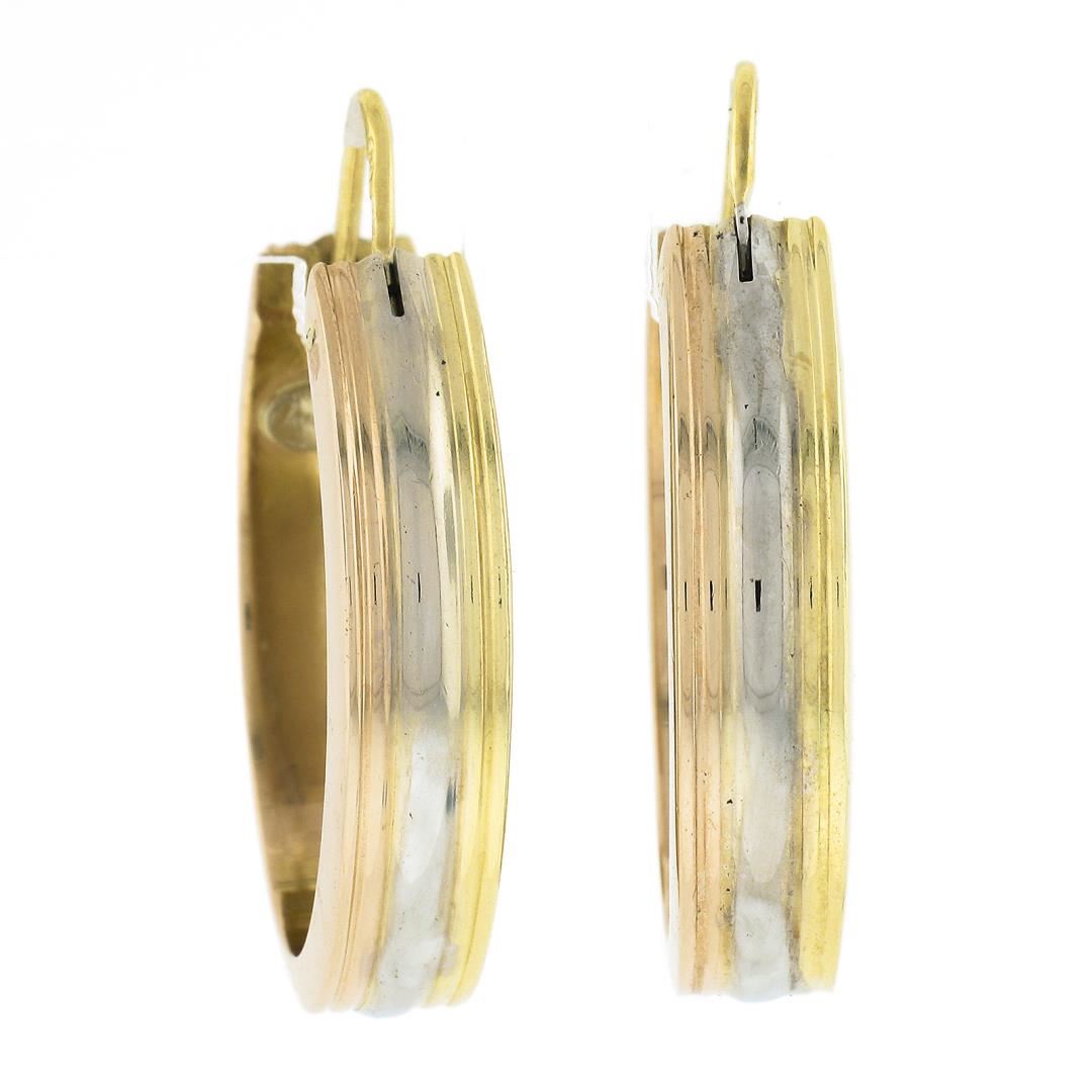A solid 18k rose, white & yellow gold hoop earrings. The earrings measure approximately 31.2x21.9mm and weigh a total of 9.47 grams.