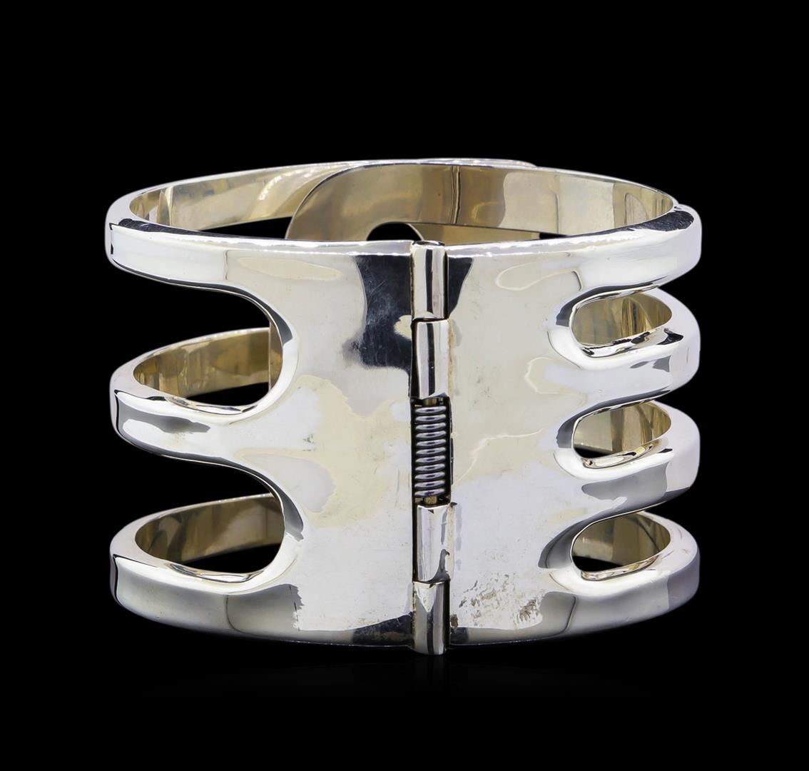 One of a kind high fashion sterling silver bracelet weighing 74.1 grams. This sterling silver promises a lasting shine.