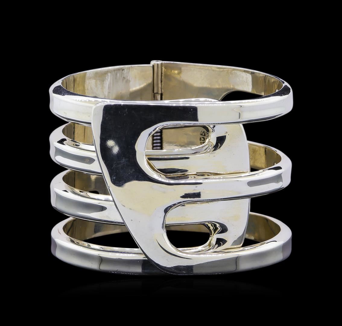 One of a kind high fashion sterling silver bracelet weighing 74.1 grams. This sterling silver promises a lasting shine.