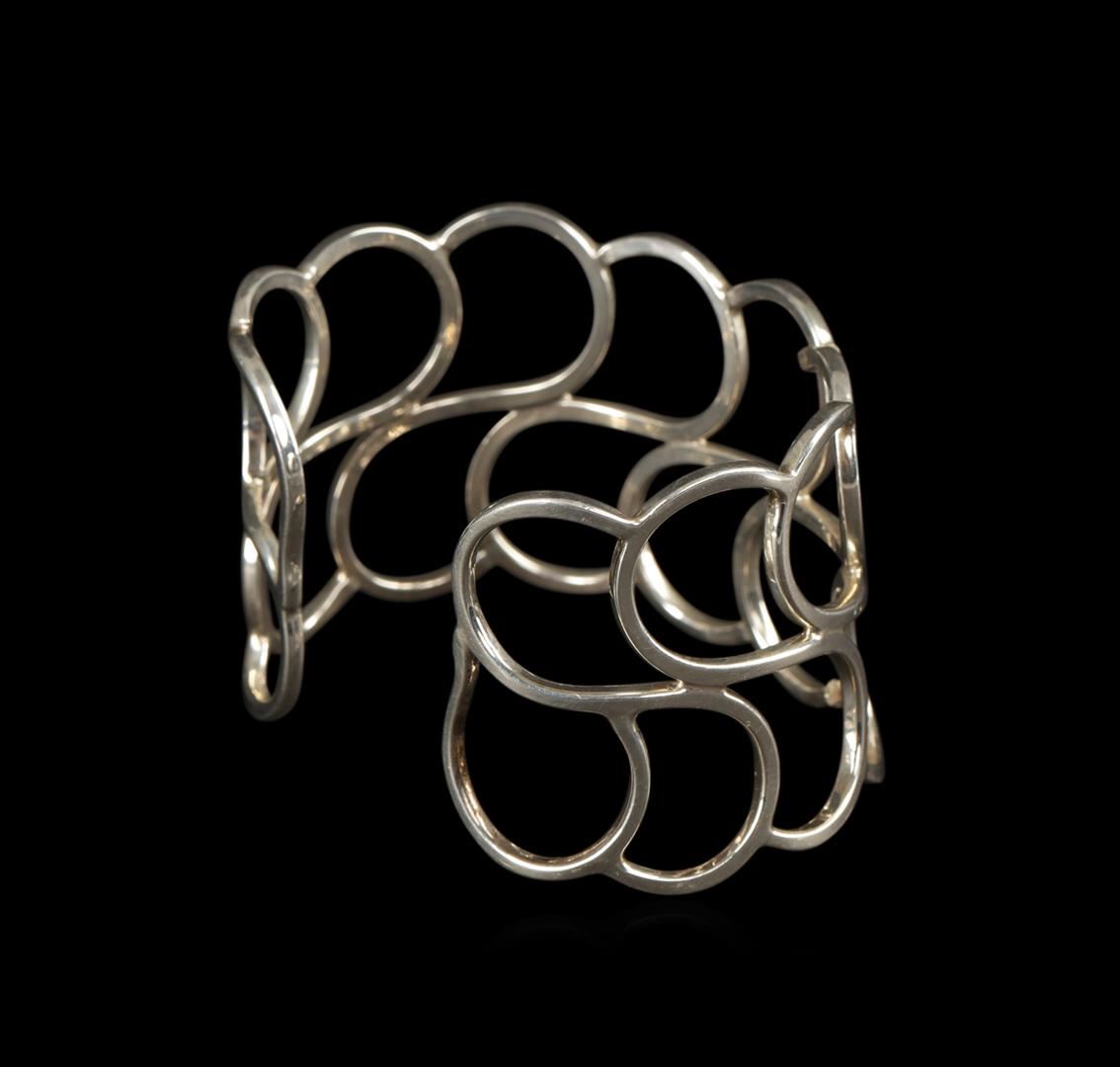 One of a kind high fashion sterling silver cuff bracelet weighing 34.5 grams. This sterling silver promises a lasting shine.