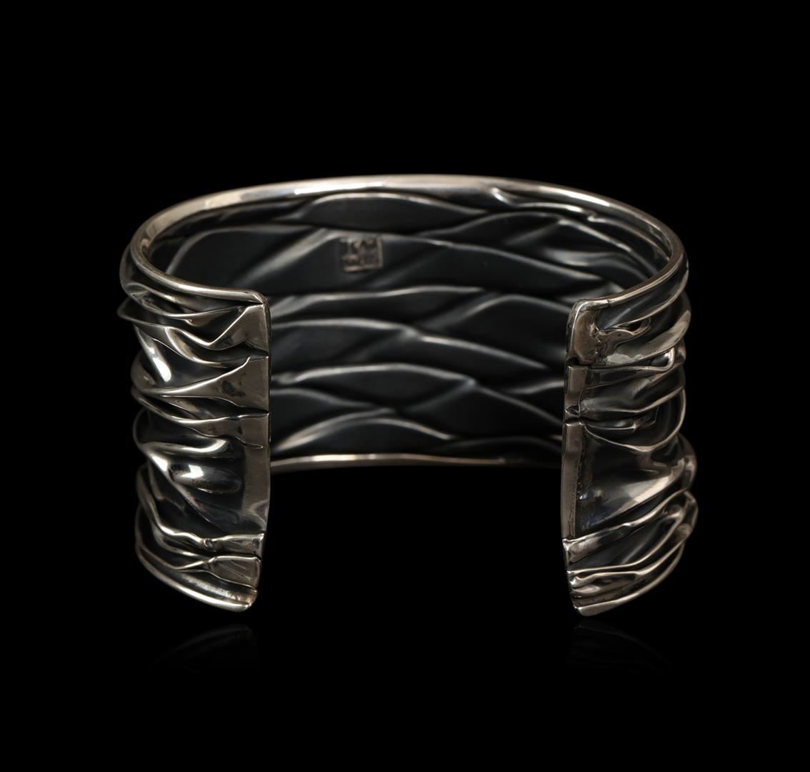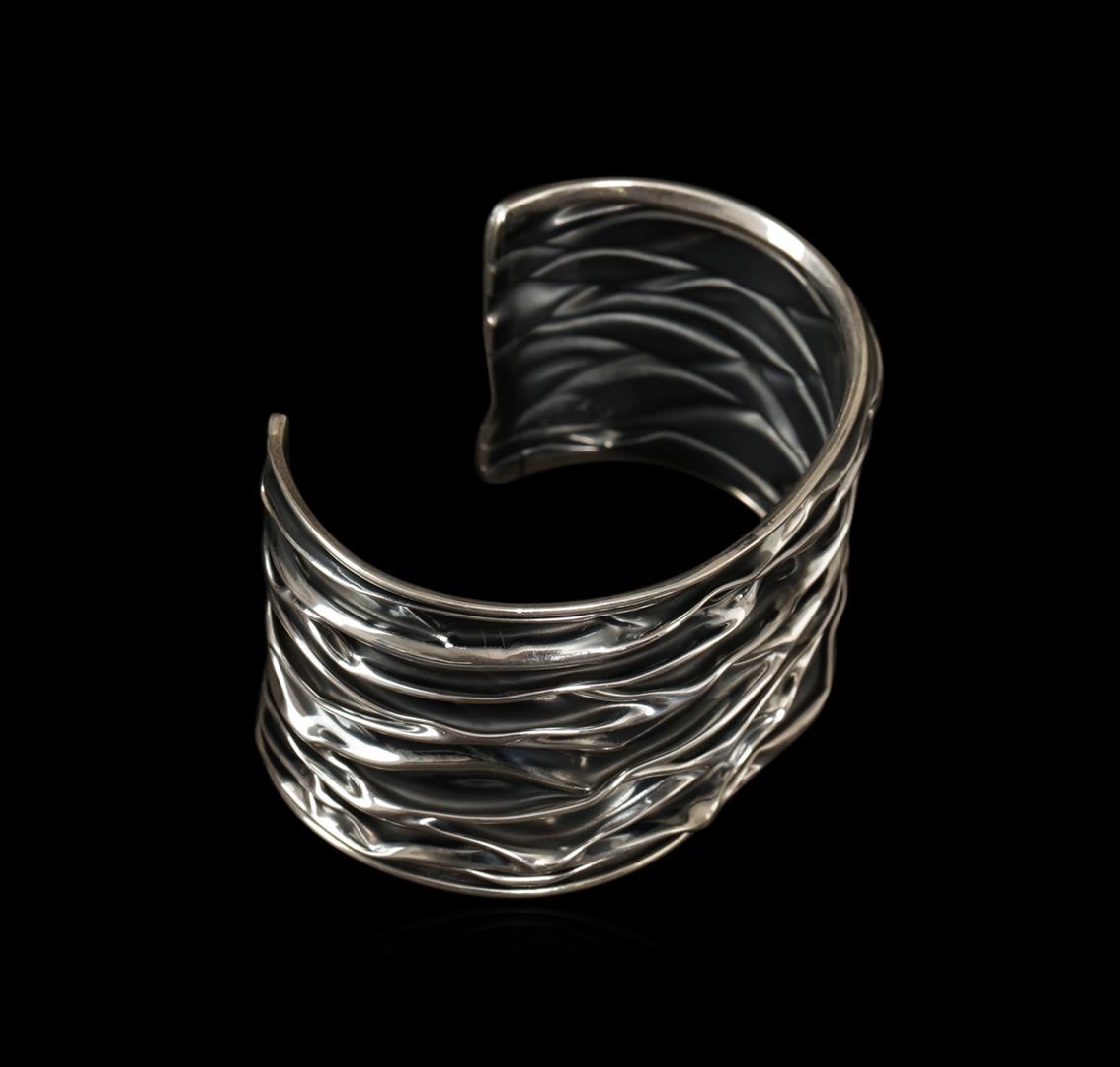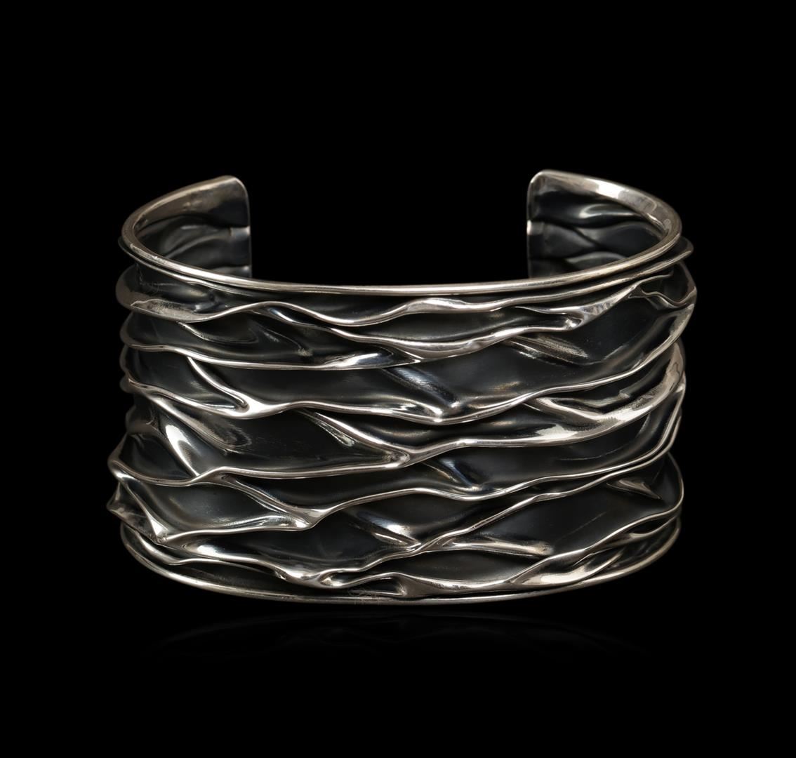 One of a kind high fashion sterling silver cuff bracelet weighing 44.1 grams. This sterling silver promises a lasting shine.