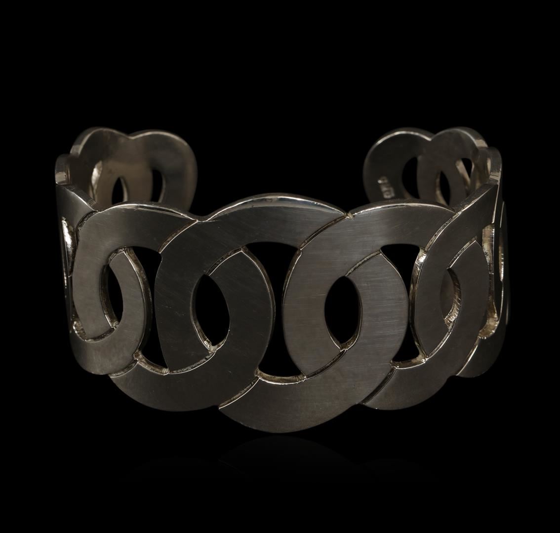 One of a kind high fashion sterling silver cuff bracelet weighing 73.4 grams. This sterling silver promises a lasting shine.