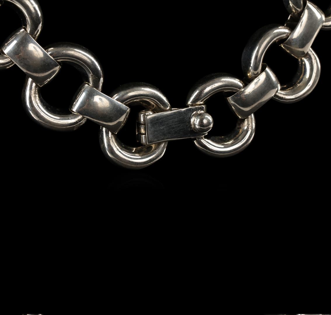One of a kind high fashion sterling silver necklace weighing 126.7 grams. This sterling silver promises a lasting shine.