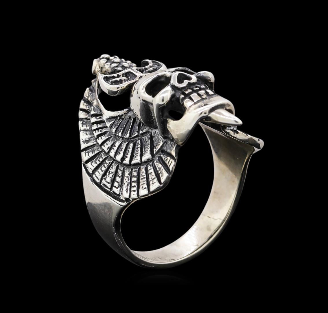 One of a kind high fashion sterling silver skull ring weighing 14.1 grams. This sterling silver promises a lasting shine.
