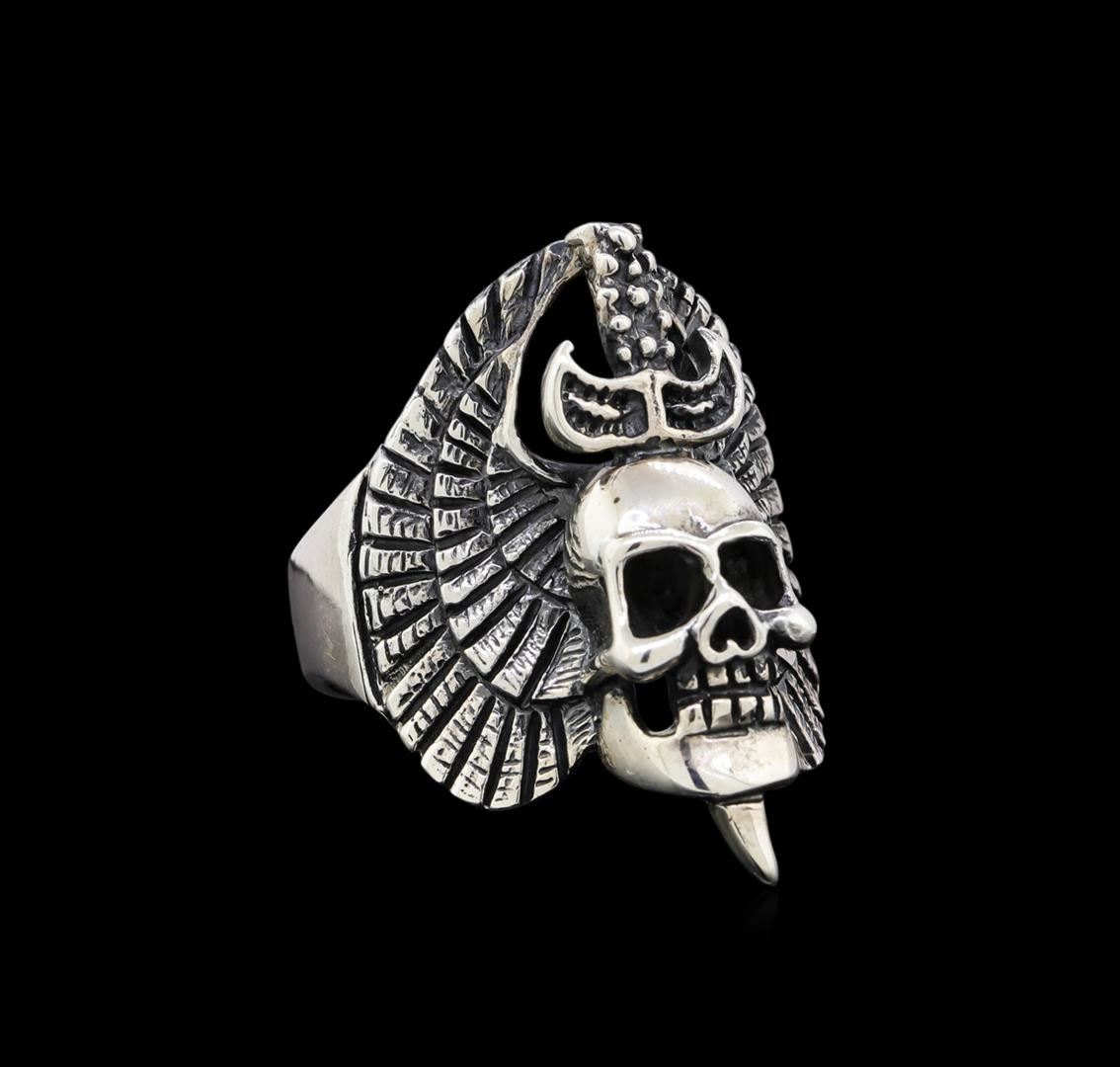 One of a kind high fashion sterling silver skull ring weighing 14.1 grams. This sterling silver promises a lasting shine.
