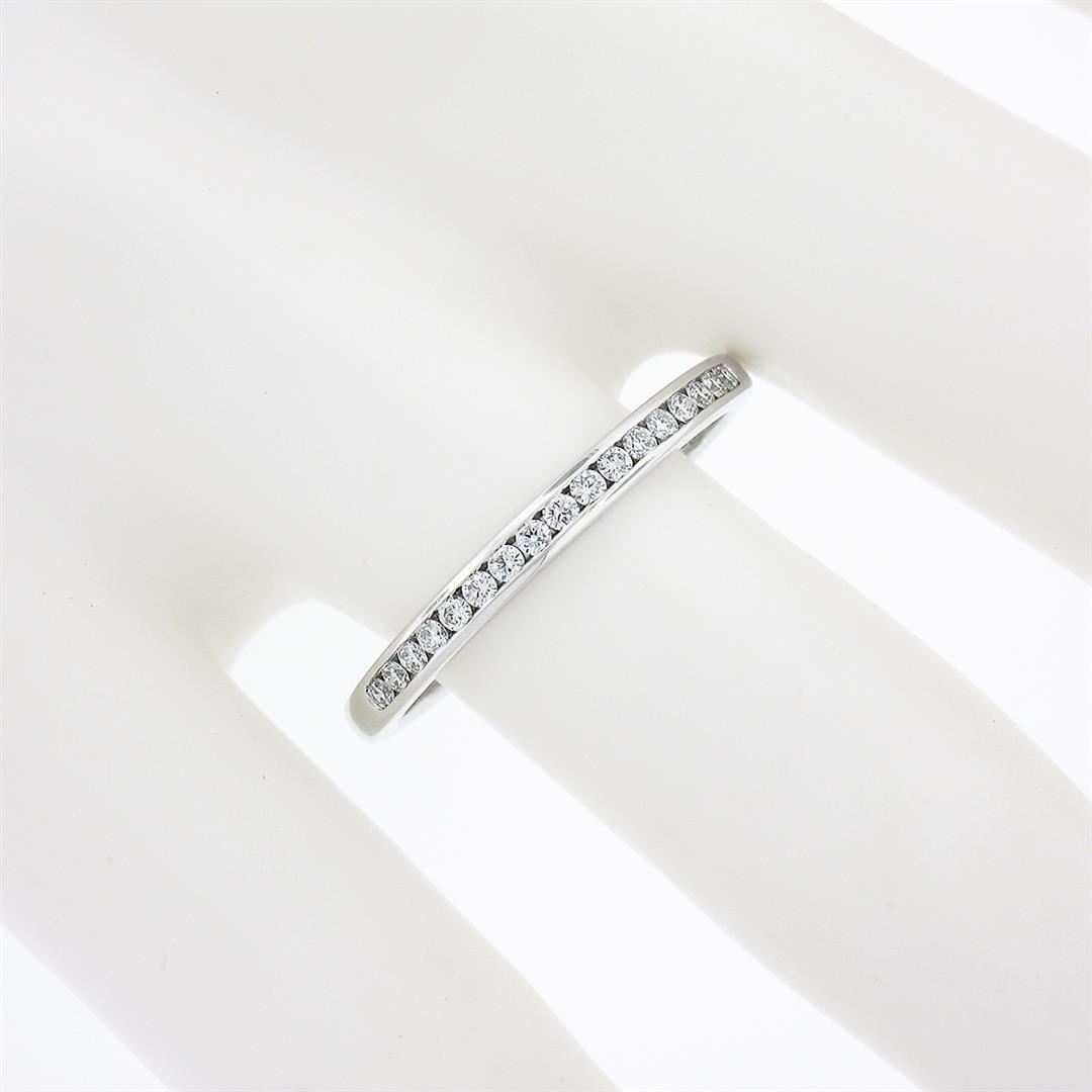 A solid platinum wedding band ring by Tiffany & Co. with 17 round brilliant cut natural diamonds (E/F - VVS1/VS1 ; 0.26ctw). The ring is size 8.5, weighs a total of 3.29 grams, and measures 2.3mm wide.