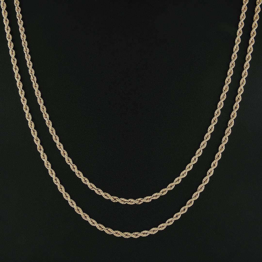 A solid 14k yellow gold long rope link chain necklace. It weighs a total of 65.35 grams, measures 4mm wide, and measures 46 inches in length.