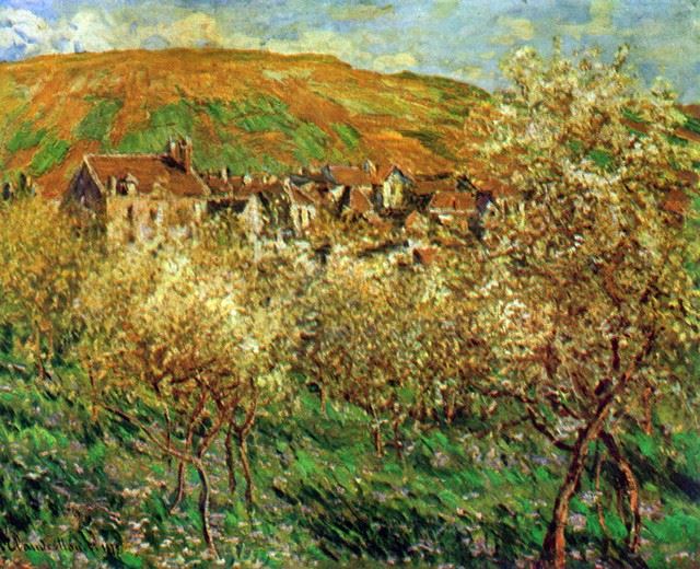 Artist: Claude Monet - Title: Flowering Apple Trees - Medium: Fine Art Reproduction Giclee on Canvas - Image Size: Approximately 16.5 inches x 20 inches - Unframed on Unstretched Canvas - Biography: Claude Monet was born on November 14, 1840, in Paris, France. He enrolled in the Academy Suisse. After an art exhibition in 1874, a critic insultingly dubbed Monet's painting style "Impression," since it was more concerned with form and light than realism, and the term stuck. Monet struggled with depression, poverty and illness throughout his life. He died in 1926.