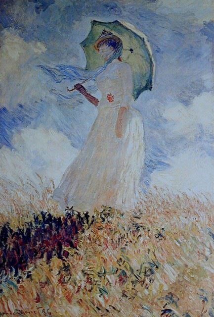 Artist: Claude Monet - Title: Lady with Umbrella - Medium: Fine Art Reproduction Giclee on Canvas - Image Size: Approximately 32 inches x 21.75 inches - Unframed on Unstretched Canvas - Biography: Claude Monet was born on November 14, 1840, in Paris, France. He enrolled in the Academy Suisse. After an art exhibition in 1874, a critic insultingly dubbed Monet's painting style "Impression," since it was more concerned with form and light than realism, and the term stuck. Monet struggled with depression, poverty and illness throughout his life. He died in 1926.