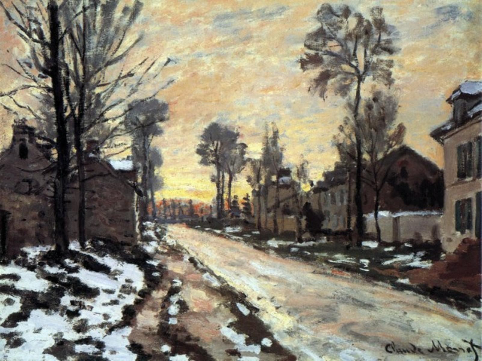Artist: Claude Monet - Title: Road to Louveciennes, Melting Snow Children, Sunset - Medium: Fine Art Reproduction Giclee on Canvas - Image Size: Approximately 24 inches x 32 inches - Unframed on Unstretched Canvas - Biography: Claude Monet was born on November 14, 1840, in Paris, France. He enrolled in the Academy Suisse. After an art exhibition in 1874, a critic insultingly dubbed Monet's painting style "Impression," since it was more concerned with form and light than realism, and the term stuck. Monet struggled with depression, poverty and illness throughout his life. He died in 1926.