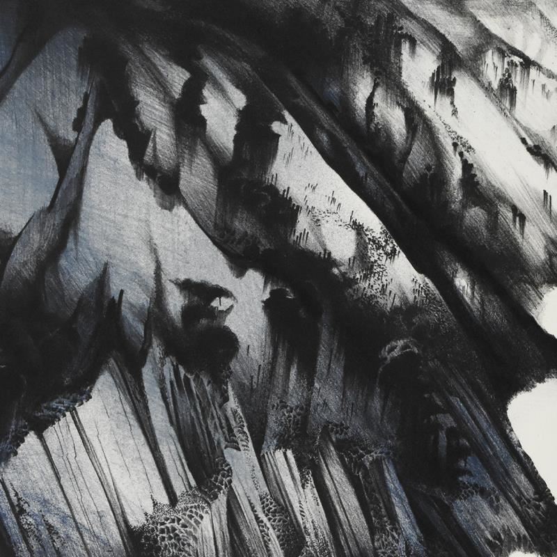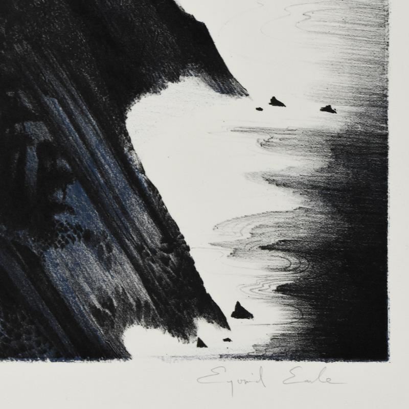 "Cliffs of Darkness" is a limited edition lithograph on paper by Eyvind Earle (1916-2000), numbered and hand signed by the artist. Measures approx. 26" x 26" (border), 20" x 16" (image). There may be minor creases on one or more of the corners; this may be concealed when the piece is framed.