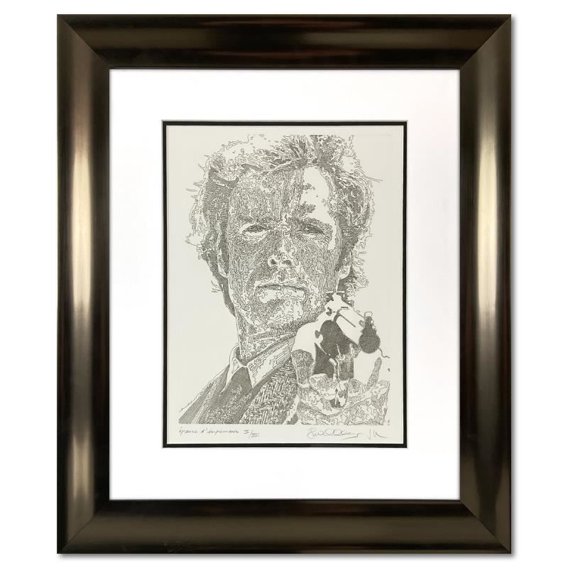 "Clint Eastwood" is a limited edition etching on paper by Guillaume Azoulay, numbered II/III and hand signed by the artist. This piece comes custom framed. Includes Letter of Authenticity. Measures approx. 21.5" x 25.5" (frame), 10.5" x 15" (image).