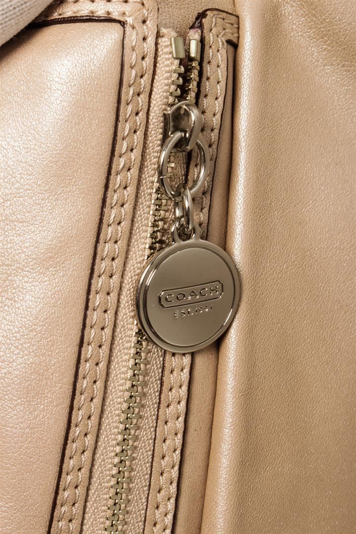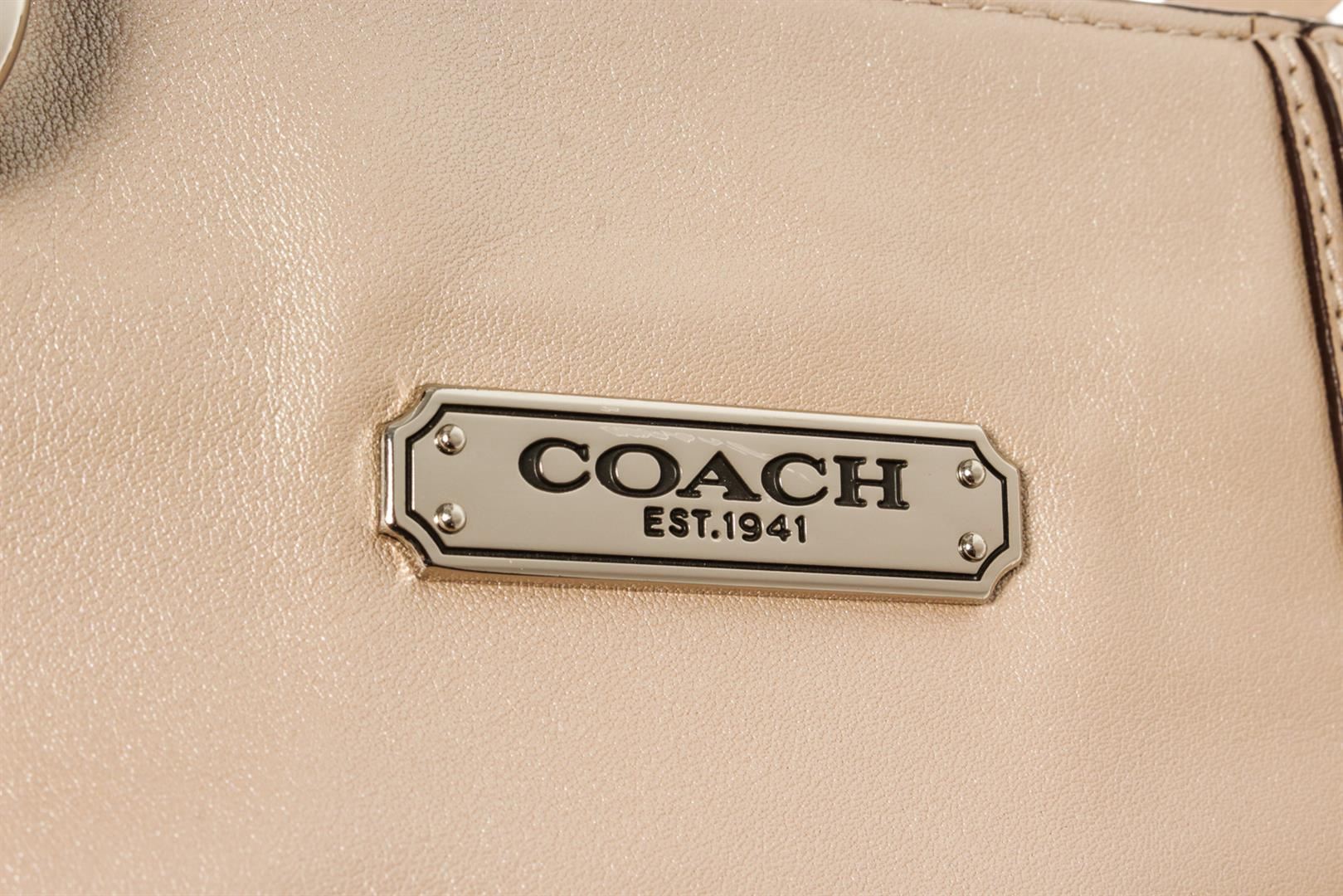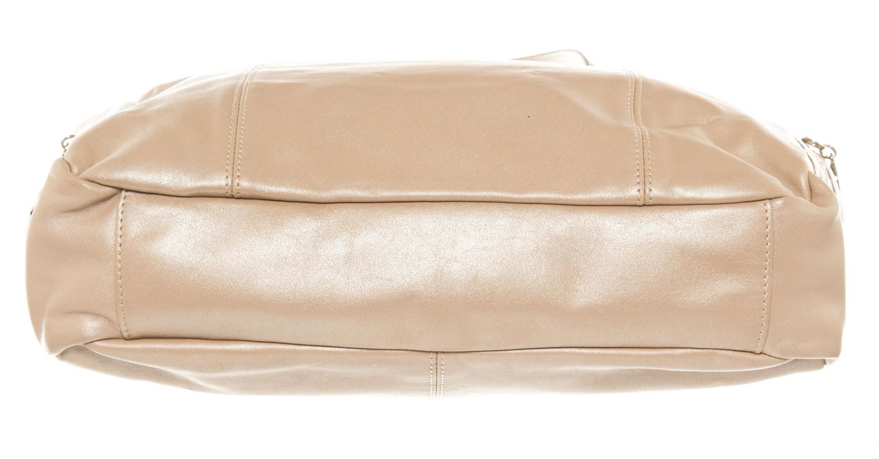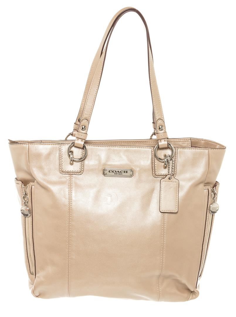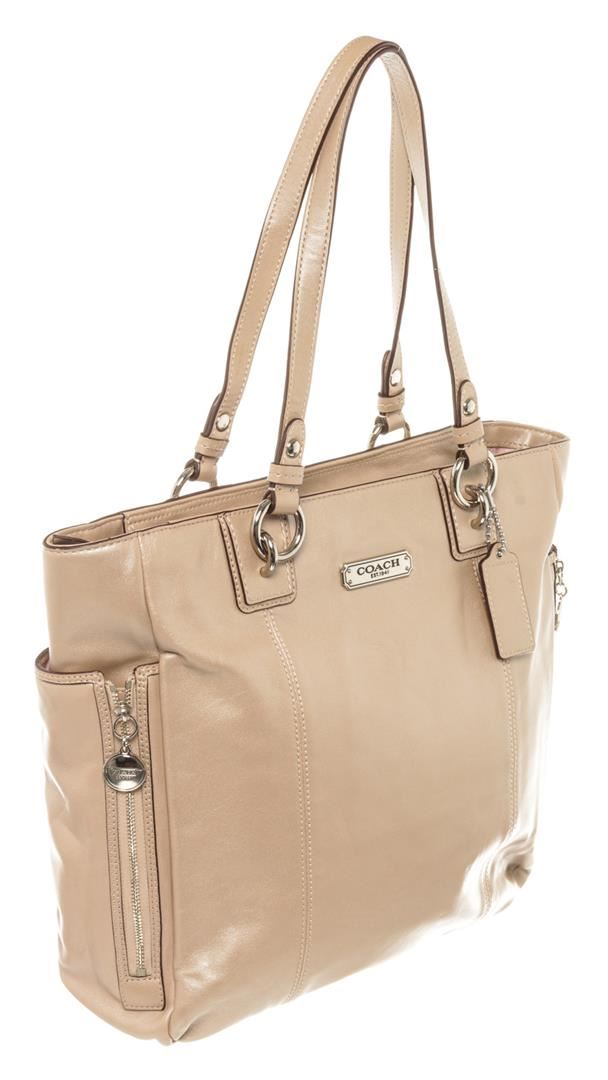 Beige leather Coach Gallery Zipper tote bag with silver-tone hardware, main compartment with 3 pockets at interior wall; one with zip closure, zip closure at top, pink satin lining, logo placard at front and two outer pockets at both side. height 13" wi