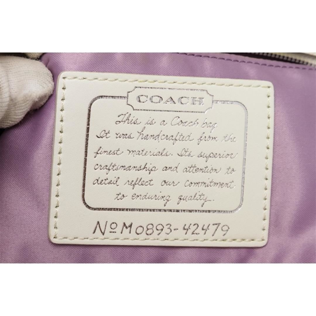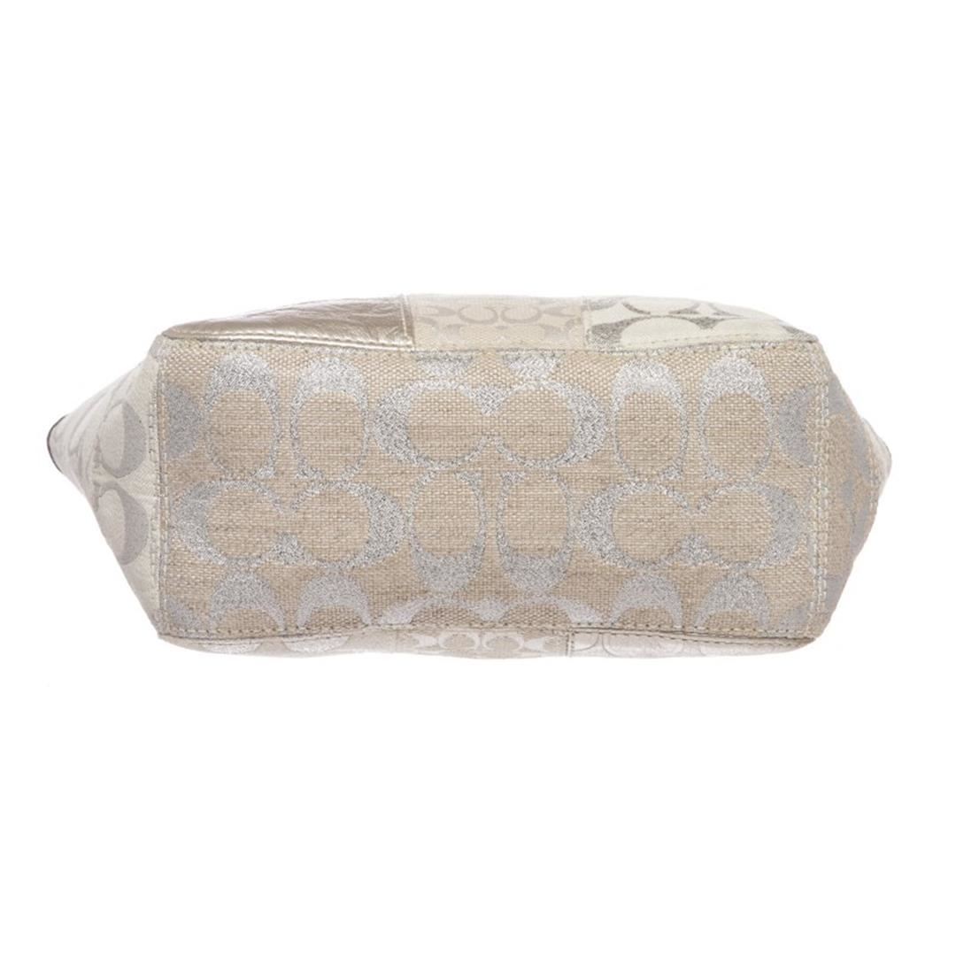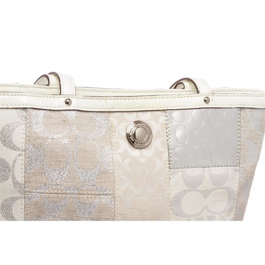One Coach Silver White Canvas Monogram Mini Tote Bag. Overall zipper closure. Interior is satin lined with oneip pocket. Dual white flat leather handles.