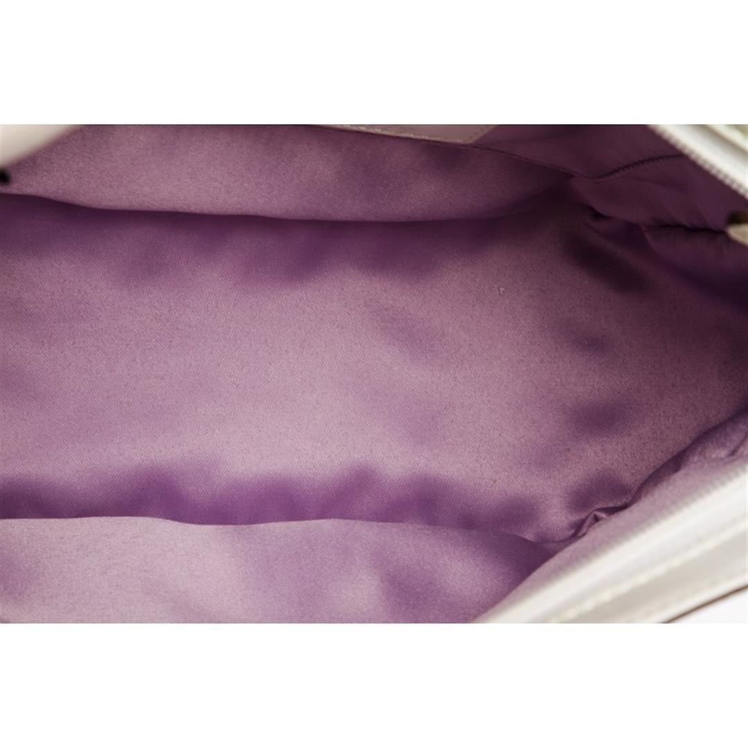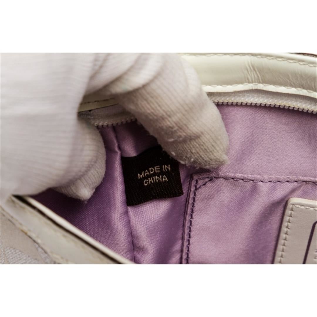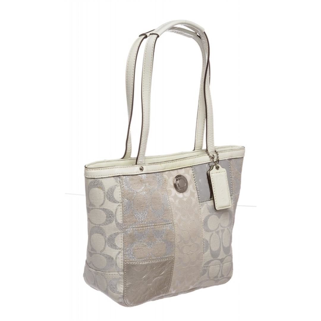 One Coach Silver White Canvas Monogram Mini Tote Bag. Overall zipper closure. Interior is satin lined with oneip pocket. Dual white flat leather handles.
