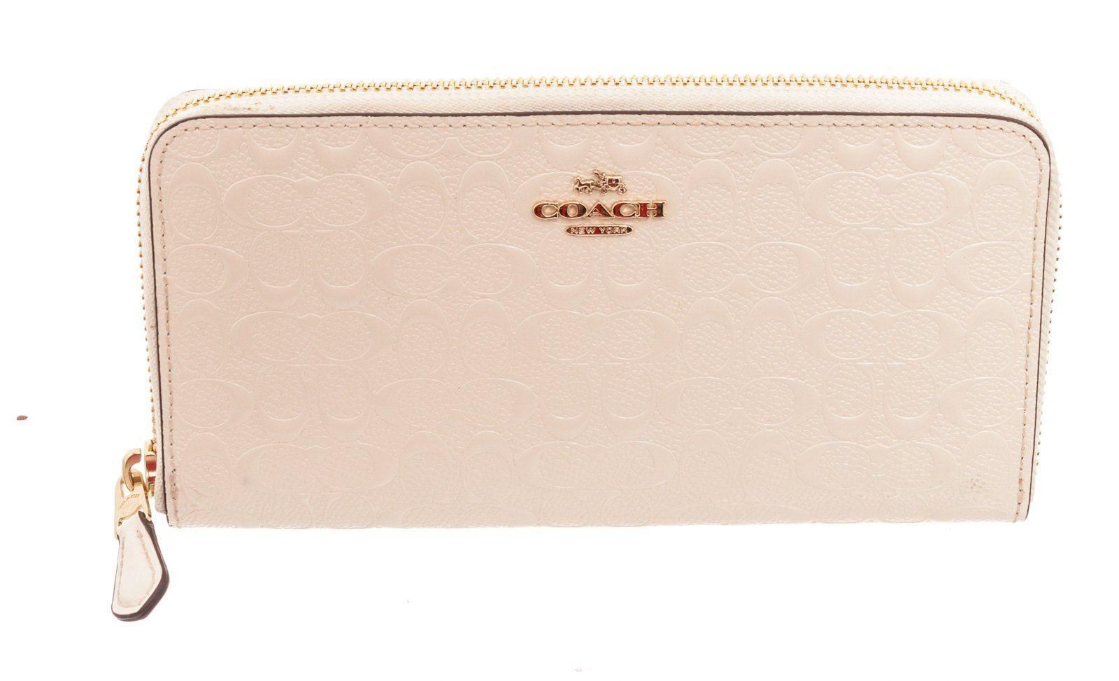 Coach white debossed logo leather zippy wallet with gold-tone hardware, logo placard at front, five interior compartments; one with zip closure, twelve cardholder slots and overall zip around closure. Measurements: Length: 8.4 in / 21 cm Width: 0.85 in / 2 cm 4.5 in / 11 cmCONDITION: Pre-Owned Good overall, please see photographs for detail.