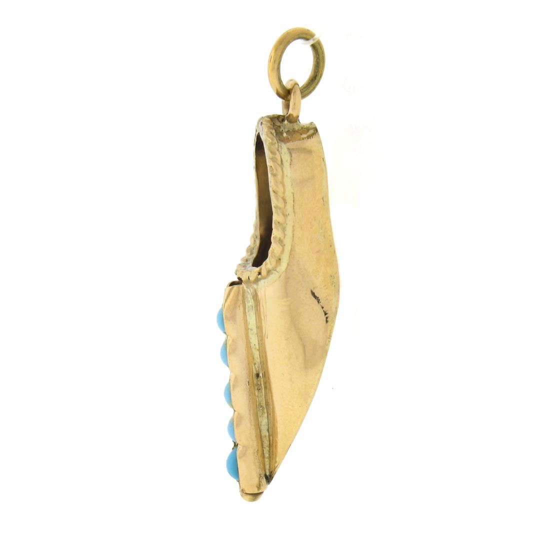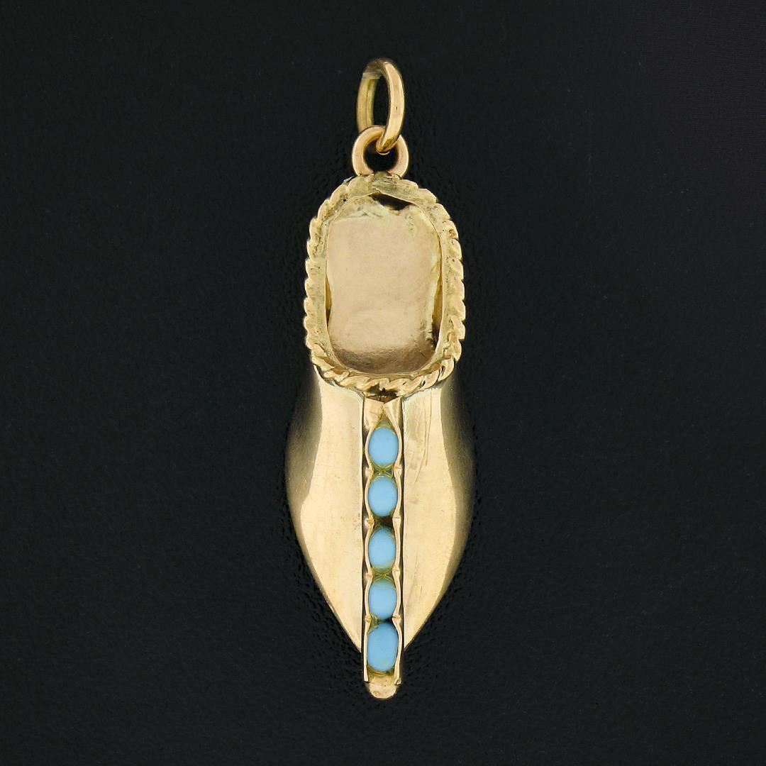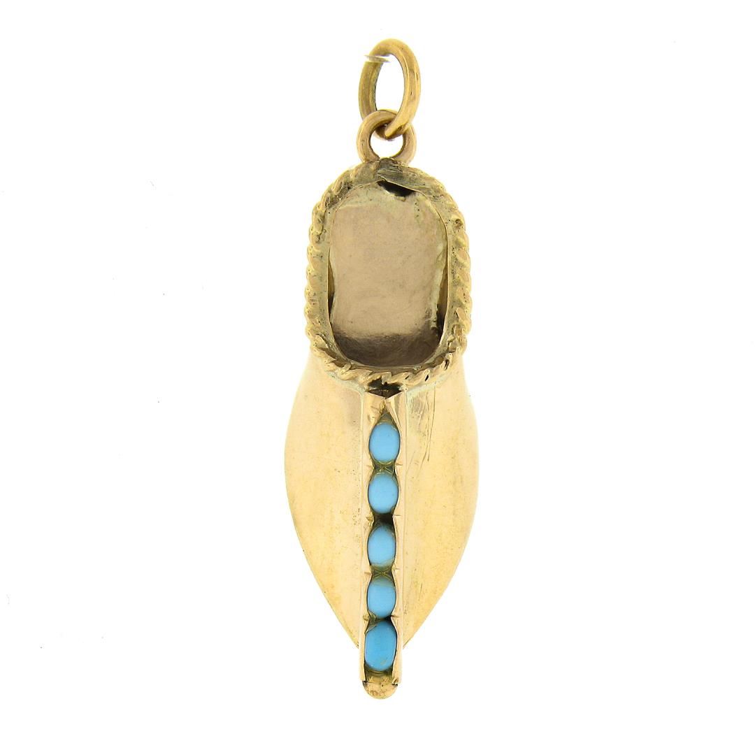 A solid 14k yellow gold shoe slipper pendant, with 5 oval cabochon cut natural turquoises (1.9x1.2mm each).. The pendant weighs a total of 1.42 grams, measures 29.9x8.9mm including the bail, and the inside of the bail measures 3mm.