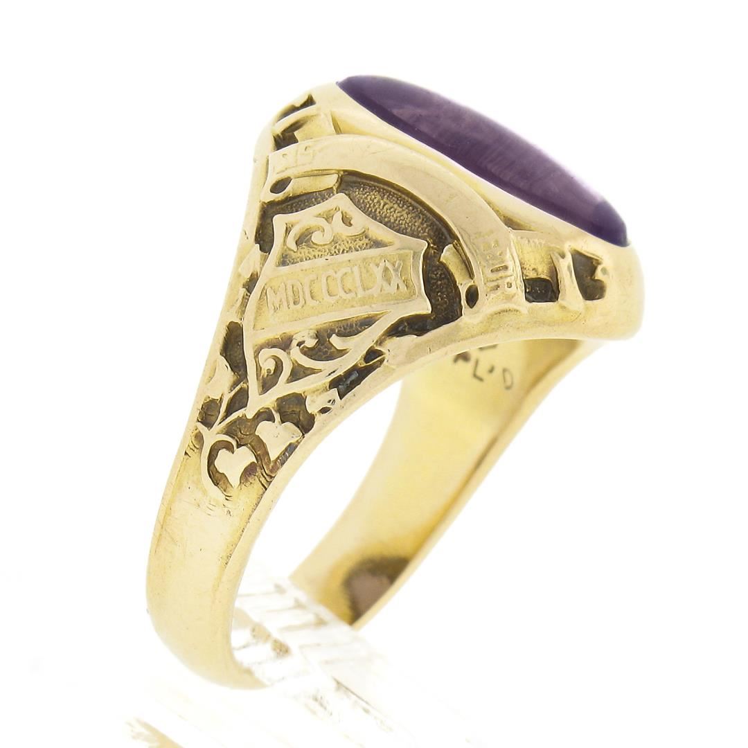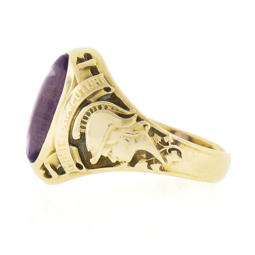 An antique solid 14k yellow gold ring. with 1 oval cut natural amethyst (11.9x6.6mm). The ring is size 5.5, weighs a total of 7.02 grams, and measures 15.1mm wide.