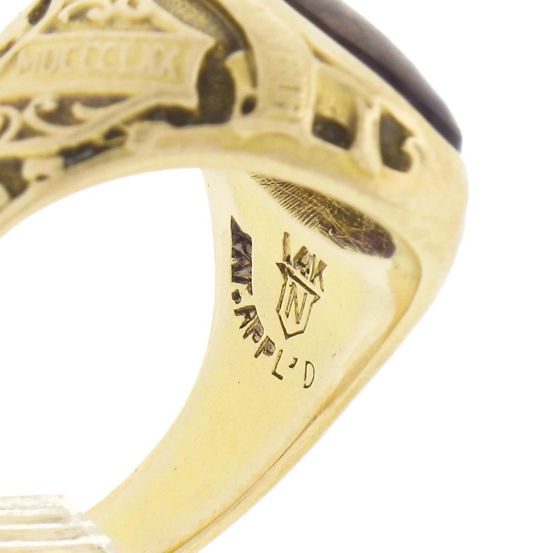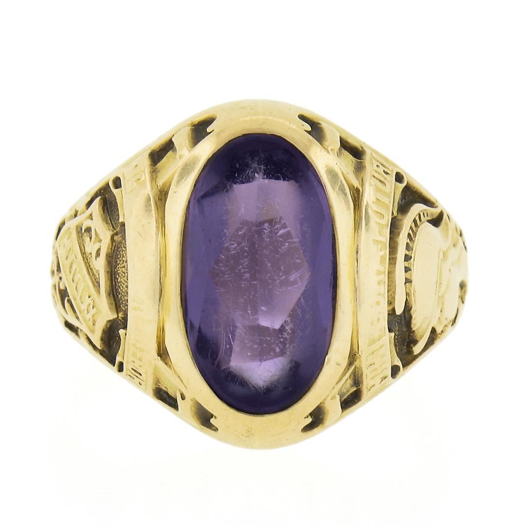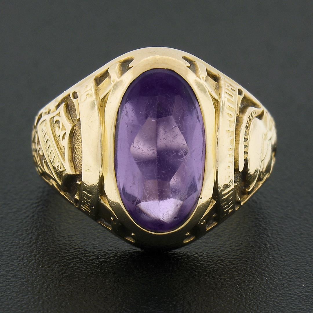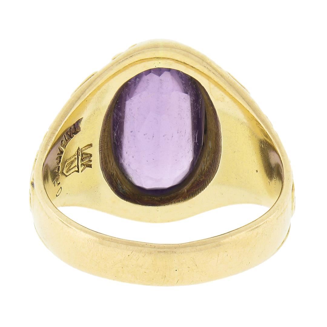 An antique solid 14k yellow gold ring. with 1 oval cut natural amethyst (11.9x6.6mm). The ring is size 5.5, weighs a total of 7.02 grams, and measures 15.1mm wide.