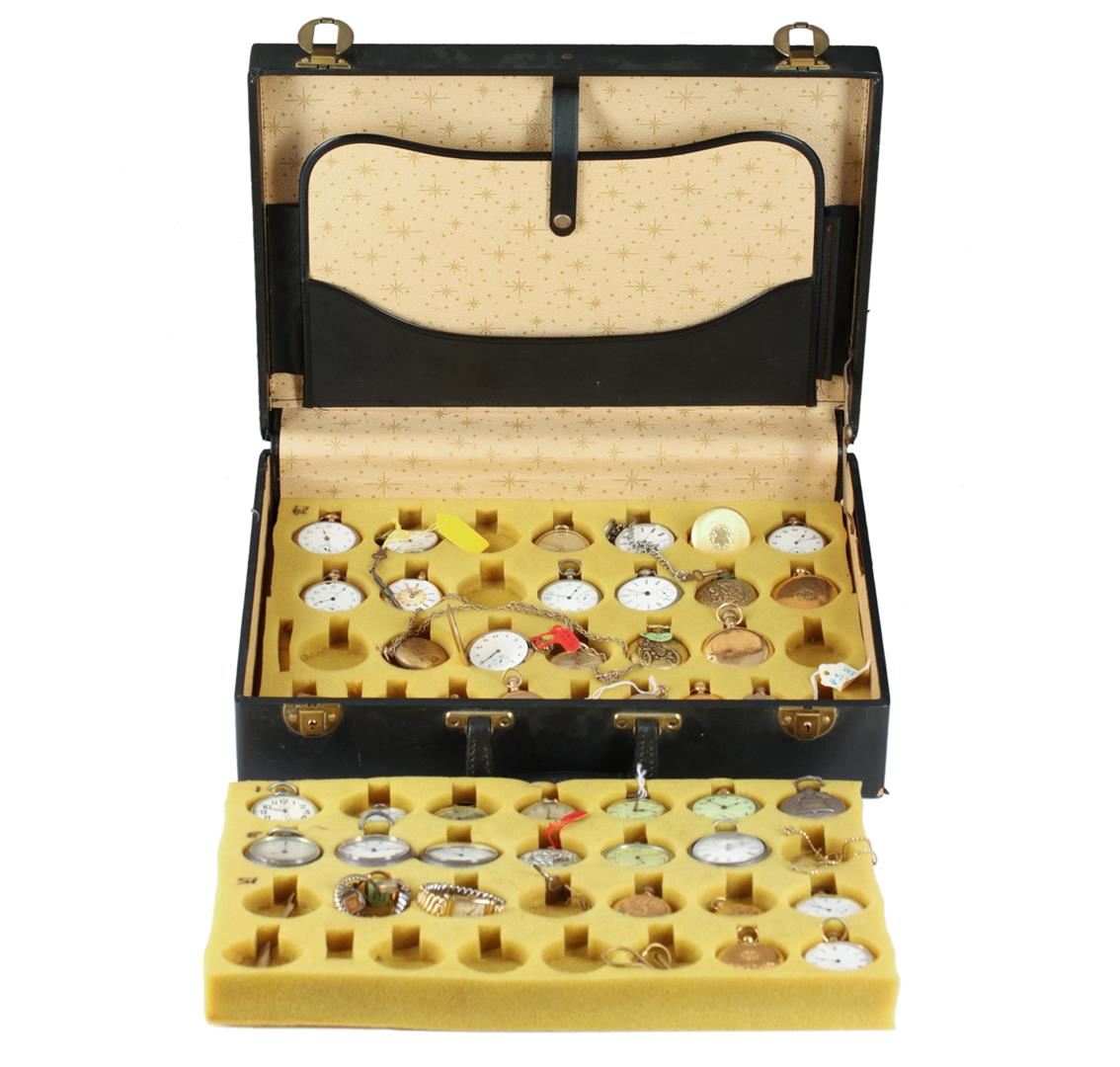 A Collection of 21 Vintage Pocketwatches, Watches, and Pins with leather suitcase. There are a total of 41 pocketwatches featuring: 2 American Watch Co., 1 American Watch Co. - Waltham, 4 Waltham, 12 Elgin, 1 Illinois, 1 Standard U.S.A., 2 Majestime, 1 Borel & Courvoisier, 2 Caravelle, 1 Ancre Ligne Droite, 1 Gruen, 1 North Star, 2 Hampden, 1 Hamilton, 1 La Marque, and 8 unknown. There are also a total of 4 vintage wristwatches featuring: 1 Waltham, 1 Banner, and 2 unknown. One of the wristwatches is missing a bracelet. Some of the pocketwatches and wristwatches are not running or have some type of other miscellaneous problem, thus this collection is perfect for those looking for spare parts and pieces. In addition to the watches, this collection comes with: 3 pins and 3 chains.