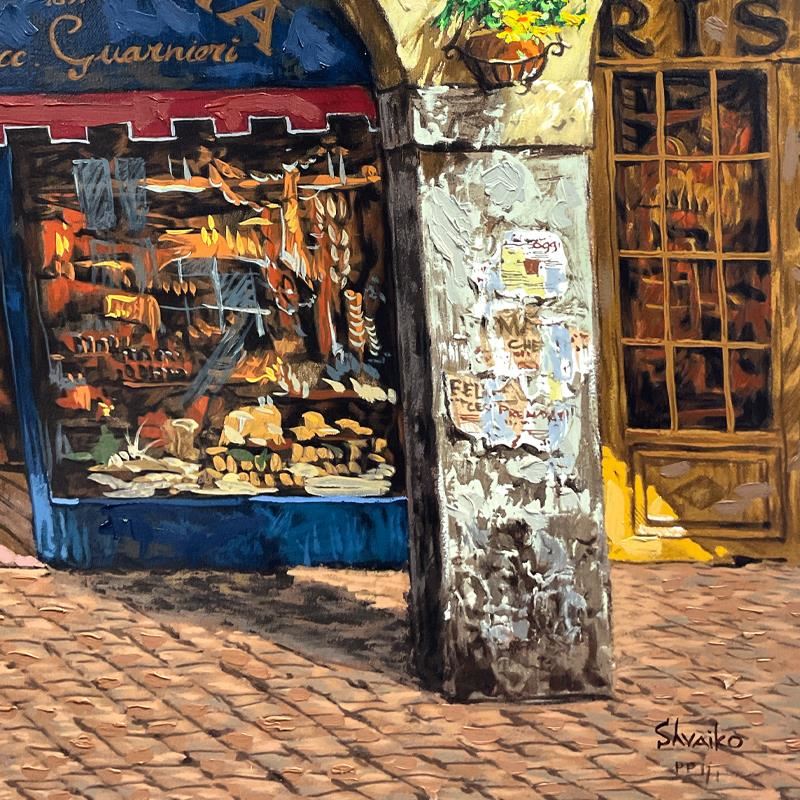 "Colors of Italy" is a hand embellished limited edition printer's proof on stretched canvas by Viktor Shvaiko, numbered 1/1 and hand signed by the artist. Includes Letter of Authenticity. Measures approx. 28" x 42" (image). There is minor wear on the corners and edges (chipping and/or hairline cracks) that will be concealed when framed.