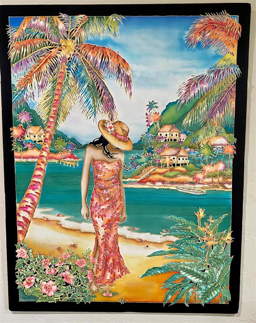Susan Patricia's "Come Rain or Shine Again" says Hawaii in an original on silk, 31" x 39.75" unframed.