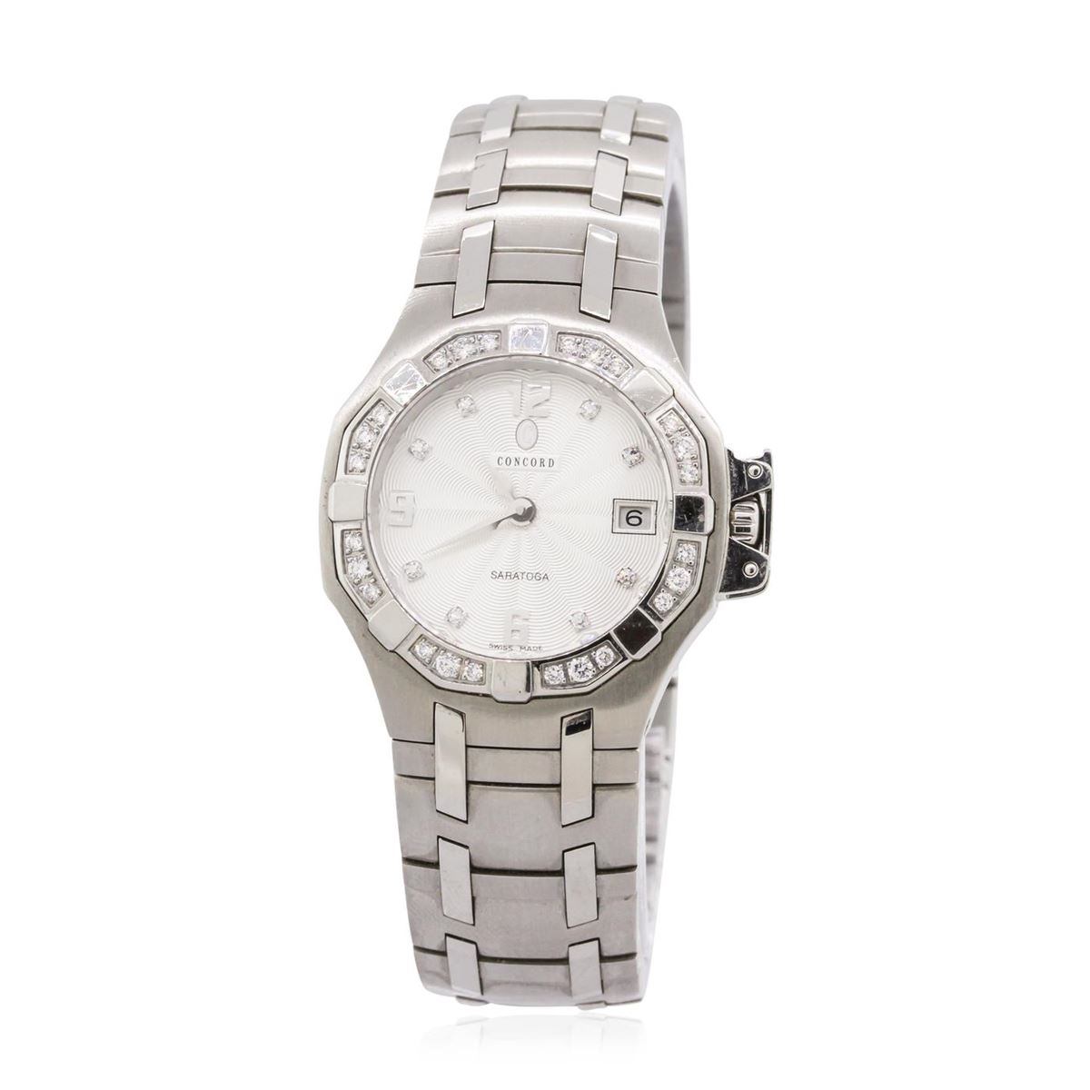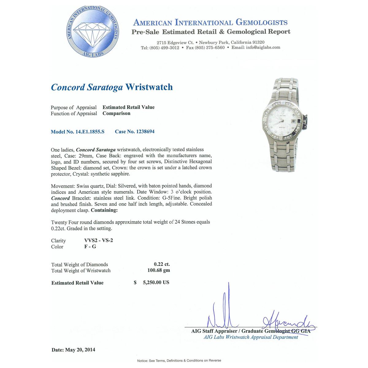 One ladies, Concord Saratoga wristwatch, electronically tested stainless steel, Case: 29mm, Case Back: engraved with the manufacturers name, logo, and ID numbers, secured by four set screws, Distinctive Hexagonal Shaped Bezel: diamond set, Crown: the crown is set under a latched crown protector, Crystal: synthetic sapphire. Movement: Swiss quartz, Dial: Silvered, with baton pointed hands, diamond indices and American style numerals. Date Window: 3 o'clock position. Concord Bracelet: stainless steel link. Condition: G-5Fine. Bright polish and brushed finish. Seven and one half inch length, adjustable. Concealed deployment clasp. Containing: Twenty Four round diamonds approximate. Total Weight of 24 Stones equals 0.22ct. Graded in the setting. Clarity: VVS2 - VS-2Color F - G Total Weight of Diamonds 0.22ct. Total Weight of Wristwatch 100.68 grams. AIG Appraised at $5,250.00.