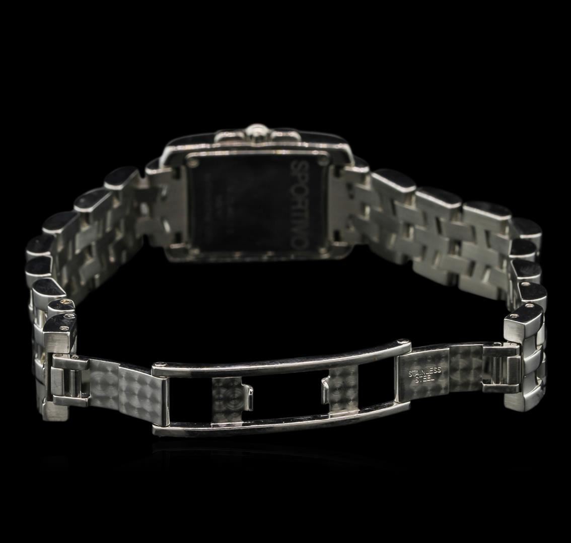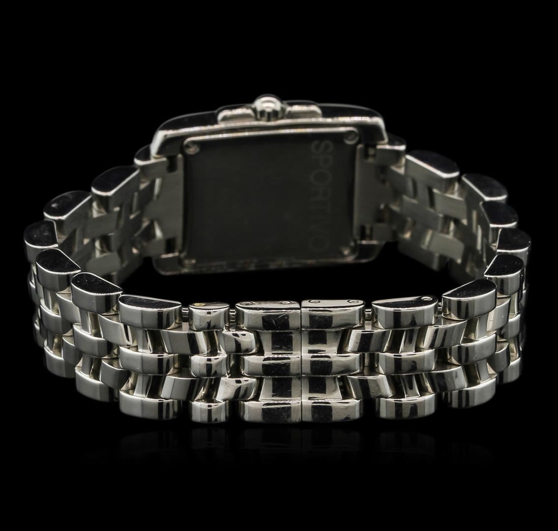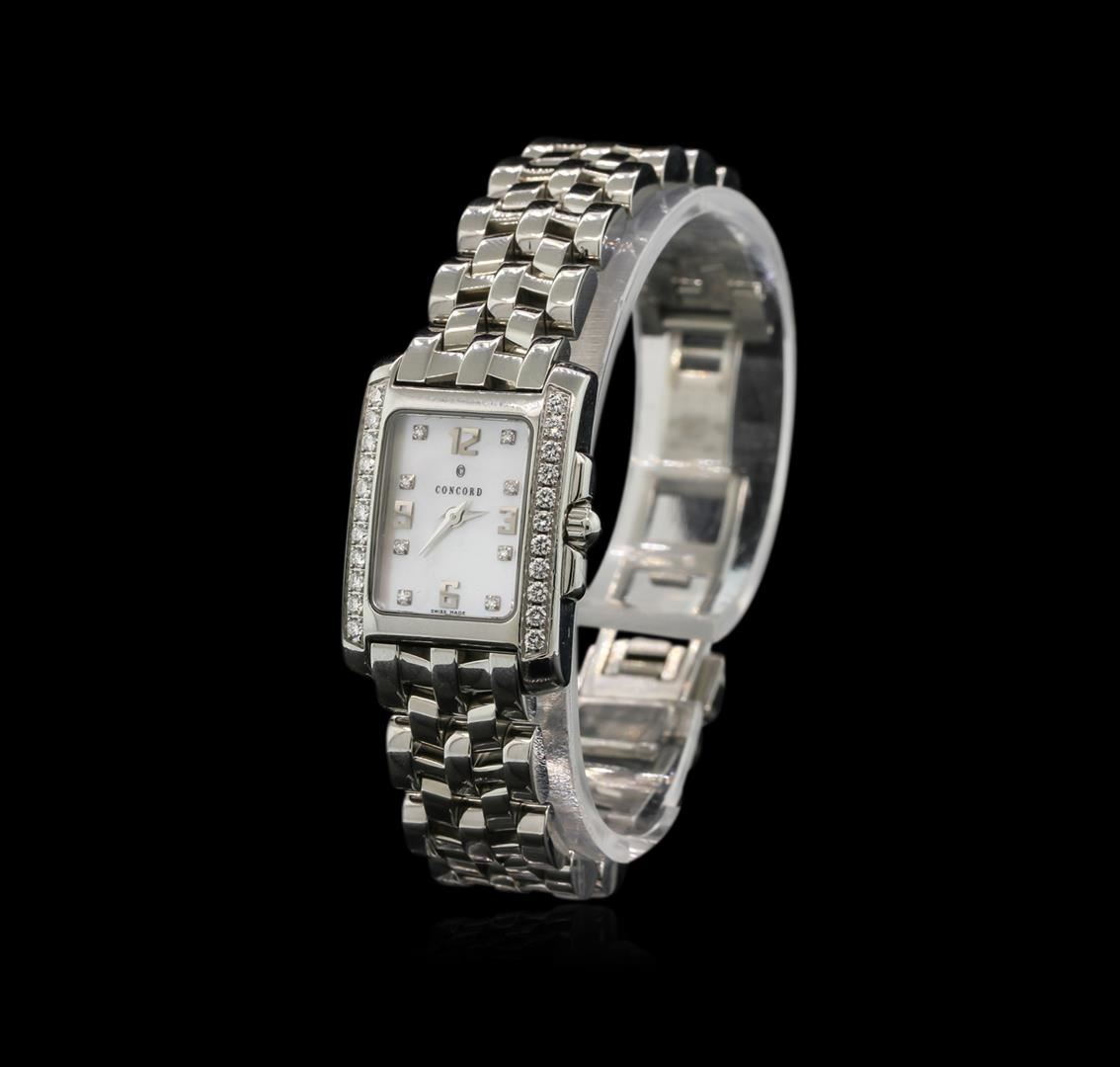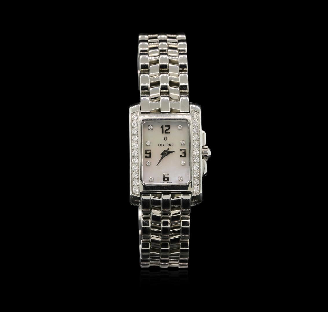 One Concord Sportivo women's wristwatch featuring : Stainless Steel link bracelet and butterfly deployment with a bright-brushed finish. Mother of Pearl dial with eight diamond index hour markers and silver tone Arabic numeral markers and stick hands. Diamond bezel and scratch resistant sapphire crystal. Water resistant. Swiss made.