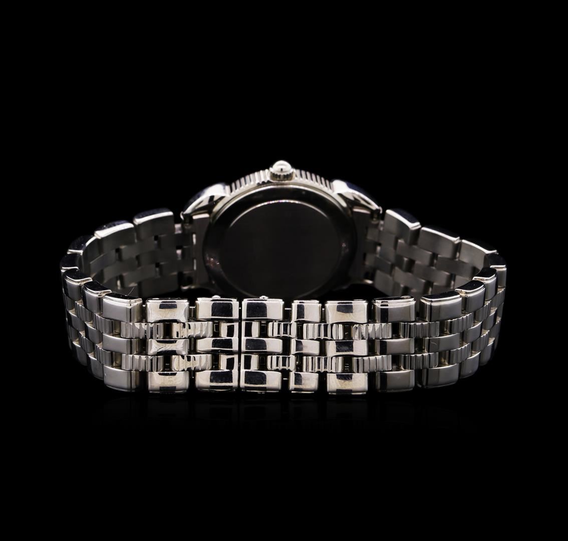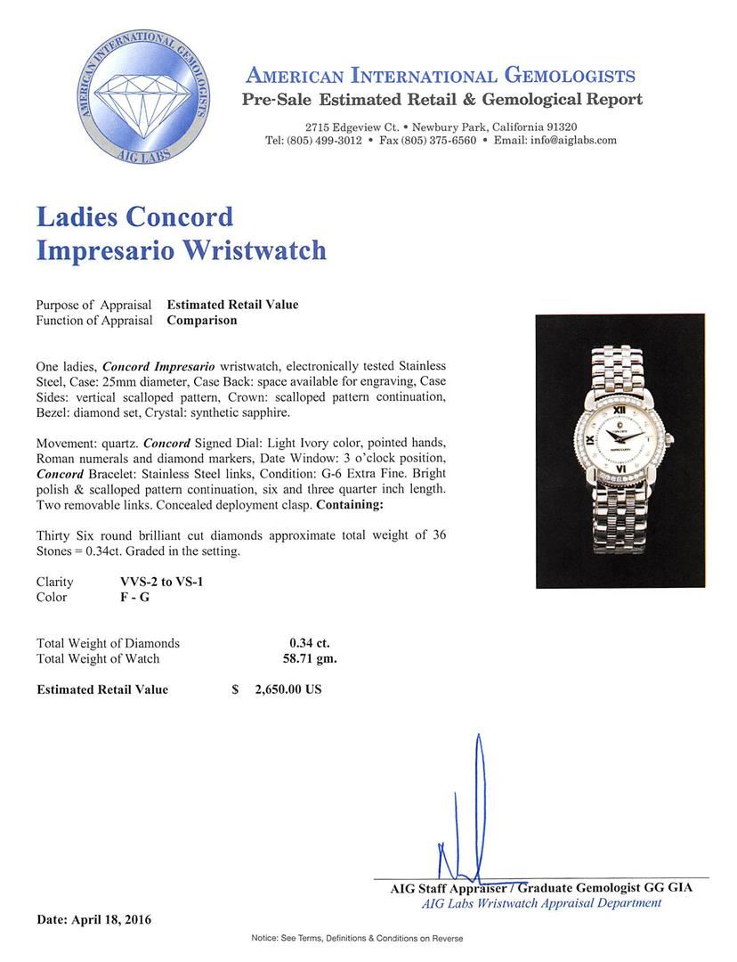 One ladies, Concord Impresario wristwatch, electronically tested Stainless Steel, Case: 25mm diameter, Case Back: space available for engraving, Case Sides: vertical scalloped pattern, Crown: scalloped pattern continuation, Bezel: diamond set, Crystal: synthetic sapphire. Movement: quartz. Concord Signed Dial: Light Ivory color, pointed hands, Roman numerals and diamond markers, Date Window: 3 o'clock position, Concord Bracelet: Stainless Steel links, Condition: G-6 Extra Fine. Bright polish & scalloped pattern continuation, six and three quarter inch length. Two removable links. Concealed deployment clasp. Containing: Thirty Six round brilliant cut diamonds approximate total weight of 36 Stones = 0.34ct. Graded in the setting. Clarity: VVS-2 to VS-1 Color F - G. Total Weight of Diamonds 0.34ct. Total Weight of Watch 58.71gm. AIG Appraised at $2,650.00.