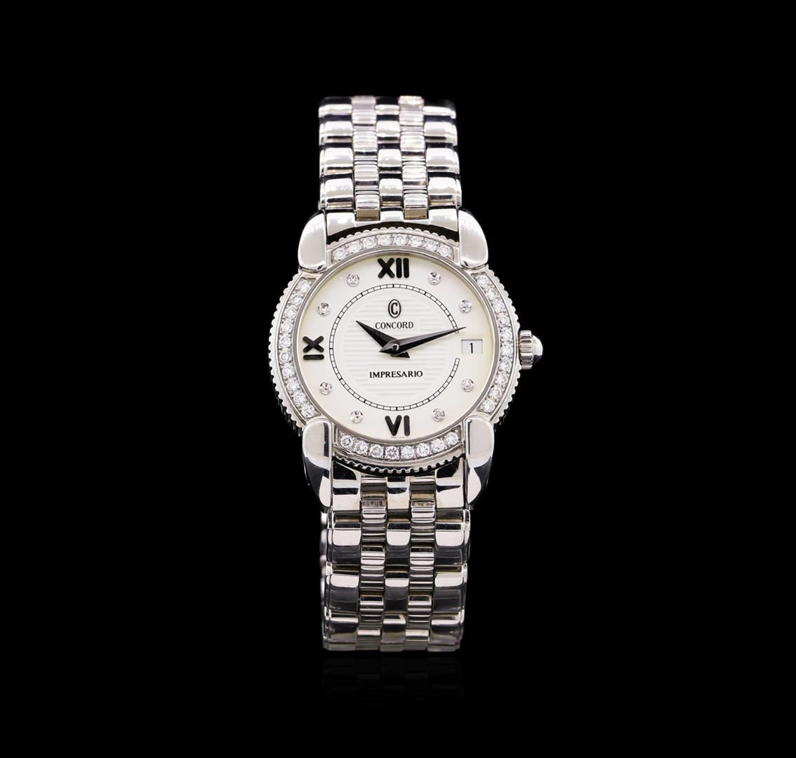 One ladies, Concord Impresario wristwatch, electronically tested Stainless Steel, Case: 25mm diameter, Case Back: space available for engraving, Case Sides: vertical scalloped pattern, Crown: scalloped pattern continuation, Bezel: diamond set, Crystal: synthetic sapphire. Movement: quartz. Concord Signed Dial: Light Ivory color, pointed hands, Roman numerals and diamond markers, Date Window: 3 o'clock position, Concord Bracelet: Stainless Steel links, Condition: G-6 Extra Fine. Bright polish & scalloped pattern continuation, six and three quarter inch length. Two removable links. Concealed deployment clasp. Containing: Thirty Six round brilliant cut diamonds approximate total weight of 36 Stones = 0.34ct. Graded in the setting. Clarity: VVS-2 to VS-1 Color F - G. Total Weight of Diamonds 0.34ct. Total Weight of Watch 58.71gm. AIG Appraised at $2,650.00.
