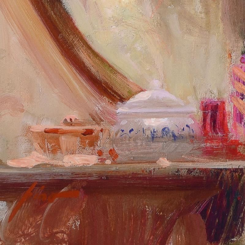 Pino's portraits allow glimpses into intensely personal, intimate spaces, conveying emotion through rich, warm color and sensual brushwork. "Contemplation" is a hand embellished limited edition giclee on canvas by Pino (1939-2010). The piece is numbered, hand signed, and includes certificate of authenticity. Measures approximately 30" x 24" (image).