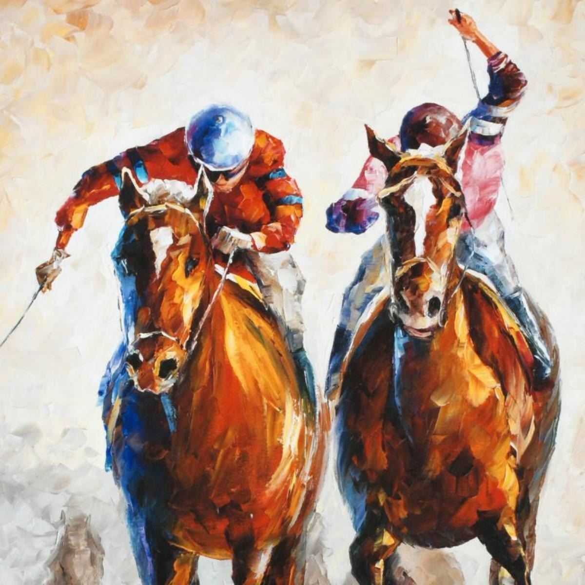 Leonid Afremov's (1955-2019) masterful use of color and texture make his paintings unique collectibles that are sure to brighten any wall. "Contenders" is a limited edition giclee on canvas. The piece is numbered and bears the artist's authorized signature. This piece comes gallery wrapped. Includes Letter of Authenticity. Measures approx. 18" x 24" (image). This item requires special handling and may have a longer than usual turnaround.