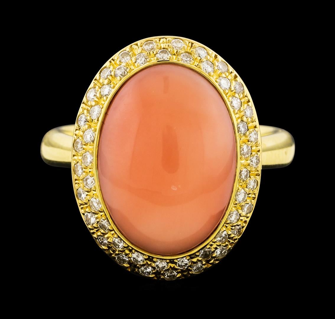 One ring featuring: 18KT Yellow Gold containing Coral and Diamonds with a total weight of 0.38ct. Total Weight of Ring: 10 grams.