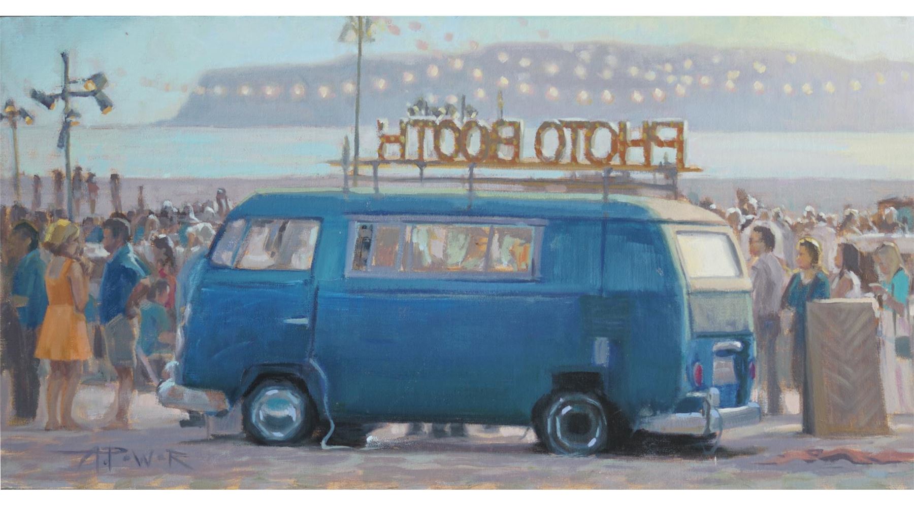 The evening light on a special event at Coronado Beach, featuring a classic VW bus, radiates from this 10x20 oil on canvas panel by Anette Power, with artist's COA