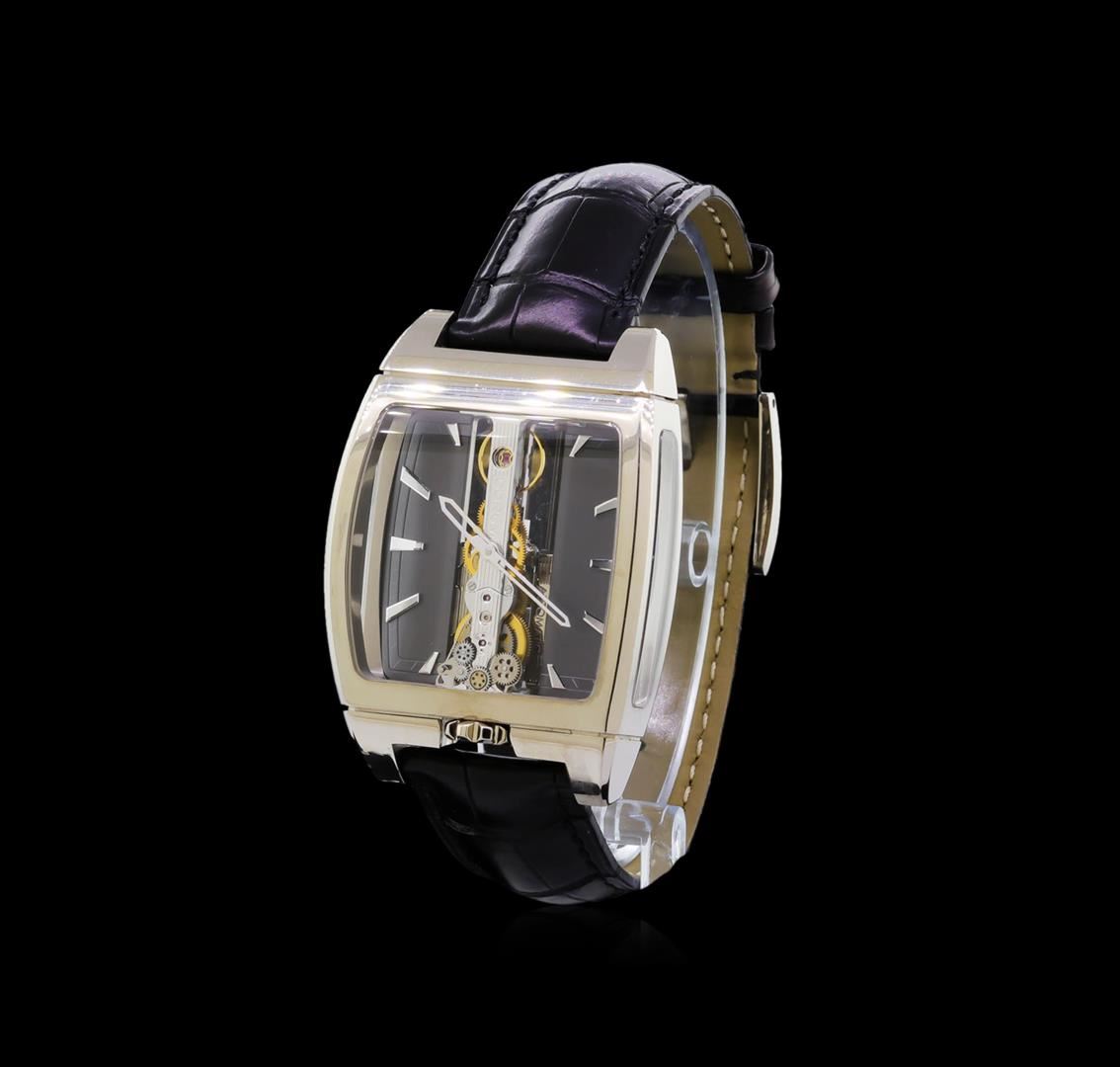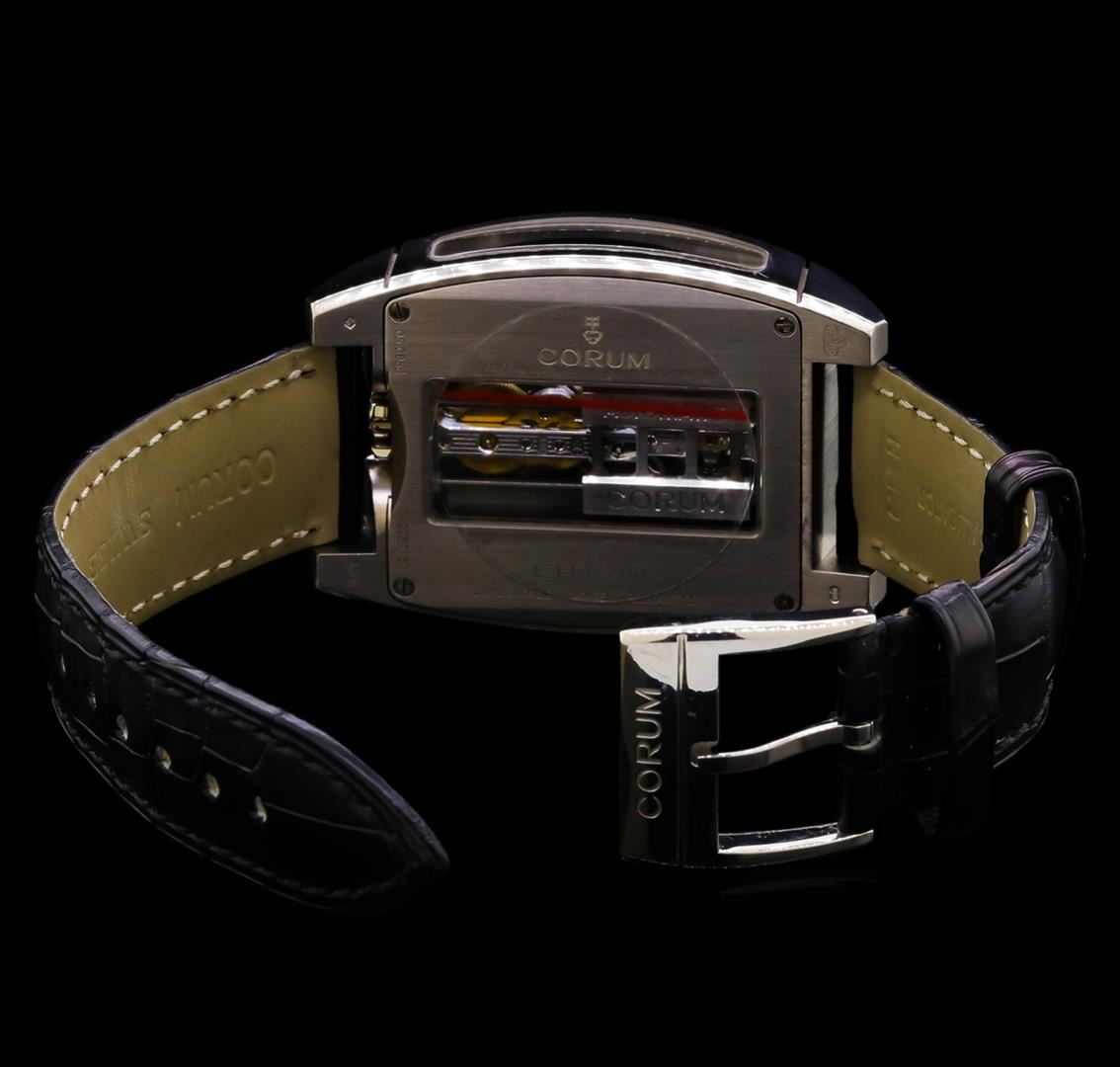 One, Corum Golden Bridge Automatique 18KT White Gold Wristwatch, Swiss Hallmarked Case: 52 x 37mm, Water Resistant 30 meters / 100 feet, Case Back: synthetic sapphire exposition, the case back frame is engraved with the manufacturers name, logo, information and ID numbers. Crown: six o'clock position, scalloped with Corum high relief key logo, Fixed Bezel: high polish finish, Crystal: synthetic sapphire, Slate color Dial: Corum Signed Bridges and plate, with raised indices and pointed hands. Corum Movement: automatic, Power Reserve: 40 hours, Corum alligator strap: Black color, saddle stitched, Swiss Hallmarked Corum 18KT White gold clasp with logo, Condition: G-7 Near Mint. Eight and one half inch length, adjustable. Total Weight of Watch134.44gm. AIG Appraised at $52,000.00.