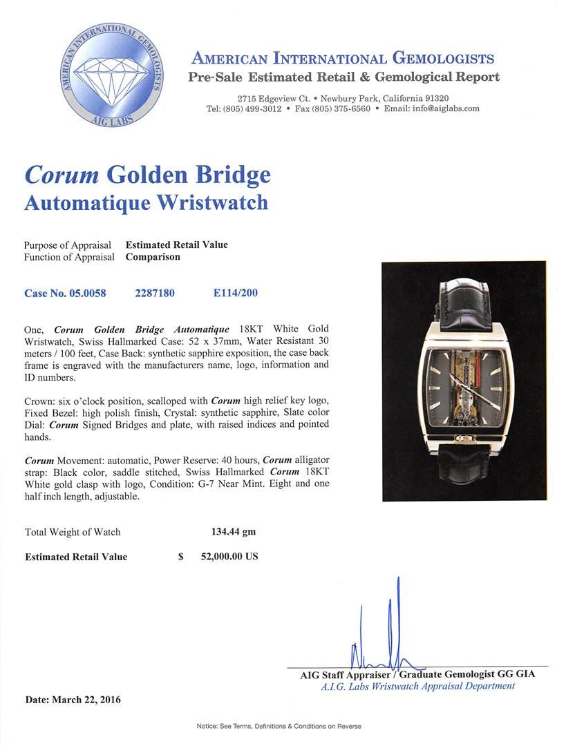 One, Corum Golden Bridge Automatique 18KT White Gold Wristwatch, Swiss Hallmarked Case: 52 x 37mm, Water Resistant 30 meters / 100 feet, Case Back: synthetic sapphire exposition, the case back frame is engraved with the manufacturers name, logo, information and ID numbers. Crown: six o'clock position, scalloped with Corum high relief key logo, Fixed Bezel: high polish finish, Crystal: synthetic sapphire, Slate color Dial: Corum Signed Bridges and plate, with raised indices and pointed hands. Corum Movement: automatic, Power Reserve: 40 hours, Corum alligator strap: Black color, saddle stitched, Swiss Hallmarked Corum 18KT White gold clasp with logo, Condition: G-7 Near Mint. Eight and one half inch length, adjustable. Total Weight of Watch134.44gm. AIG Appraised at $52,000.00.