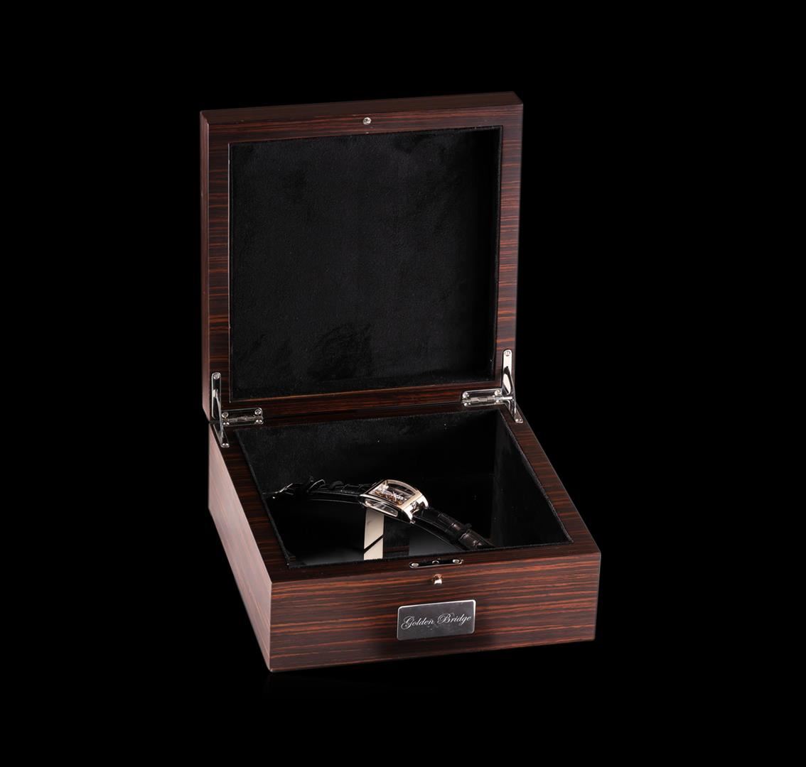 One, Corum Golden Bridge Automatique 18KT White Gold Wristwatch, Swiss Hallmarked Case: 52 x 37mm, Water Resistant 30 meters / 100 feet, Case Back: synthetic sapphire exposition, the case back frame is engraved with the manufacturers name, logo, information and ID numbers. Crown: six o'clock position, scalloped with Corum high relief key logo, Fixed Bezel: high polish finish, Crystal: synthetic sapphire, Slate color Dial: Corum Signed Bridges and plate, with raised indices and pointed hands. Corum Movement: automatic, Power Reserve: 40 hours, Corum alligator strap: Black color, saddle stitched, Swiss Hallmarked Corum 18KT White gold clasp with logo, Condition: G-7 Near Mint. Eight and one half inch length, adjustable. Total Weight of Watch134.44gm. AIG Appraised at $52,000.00.