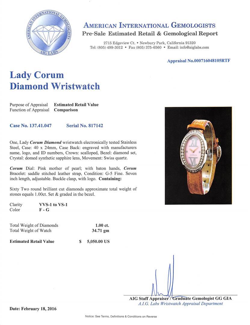 One, Lady Corum Diamond wristwatch electronically tested Stainless Steel, Case: 40 x 24mm, Case Back: engraved with manufacturers name, logo, and ID numbers, Crown: scalloped, Bezel: diamond set, Crystal: domed synthetic sapphire lens, Movement: Swiss quartz. Corum Dial: Pink mother of pearl; with baton hands, Corum Bracelet: saddle stitched leather strap, Condition: G-5 Fine. Seven inch length, adjustable. Buckle clasp, with logo. Containing: Sixty Two round brilliant cut diamonds approximate total weight of stones equals 1.00ct. Set & graded in the bezel. Clarity: VVS-1 to VS-1. Color: F - G. Total Weight of Diamonds 1.00ct. Total Weight of Watch 34.71gm. AIG Appraised at $5,050.00.