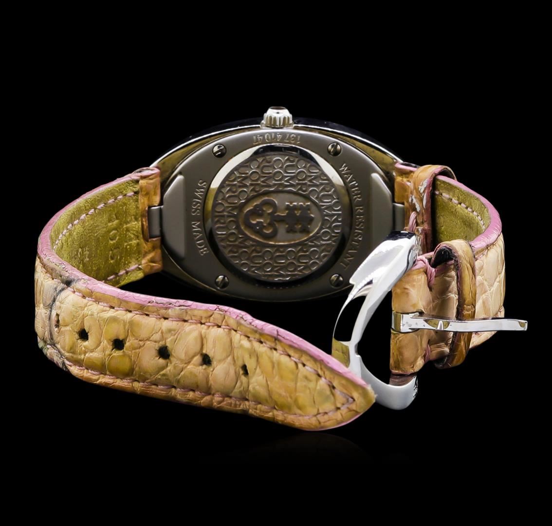 One, Lady Corum Diamond wristwatch electronically tested Stainless Steel, Case: 40 x 24mm, Case Back: engraved with manufacturers name, logo, and ID numbers, Crown: scalloped, Bezel: diamond set, Crystal: domed synthetic sapphire lens, Movement: Swiss quartz. Corum Dial: Pink mother of pearl; with baton hands, Corum Bracelet: saddle stitched leather strap, Condition: G-5 Fine. Seven inch length, adjustable. Buckle clasp, with logo. Containing: Sixty Two round brilliant cut diamonds approximate total weight of stones equals 1.00ct. Set & graded in the bezel. Clarity: VVS-1 to VS-1. Color: F - G. Total Weight of Diamonds 1.00ct. Total Weight of Watch 34.71gm. AIG Appraised at $5,050.00.