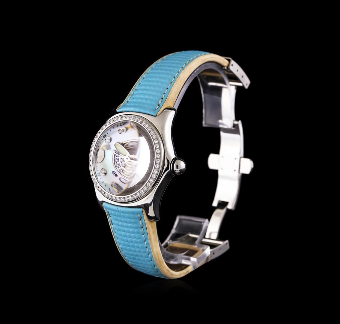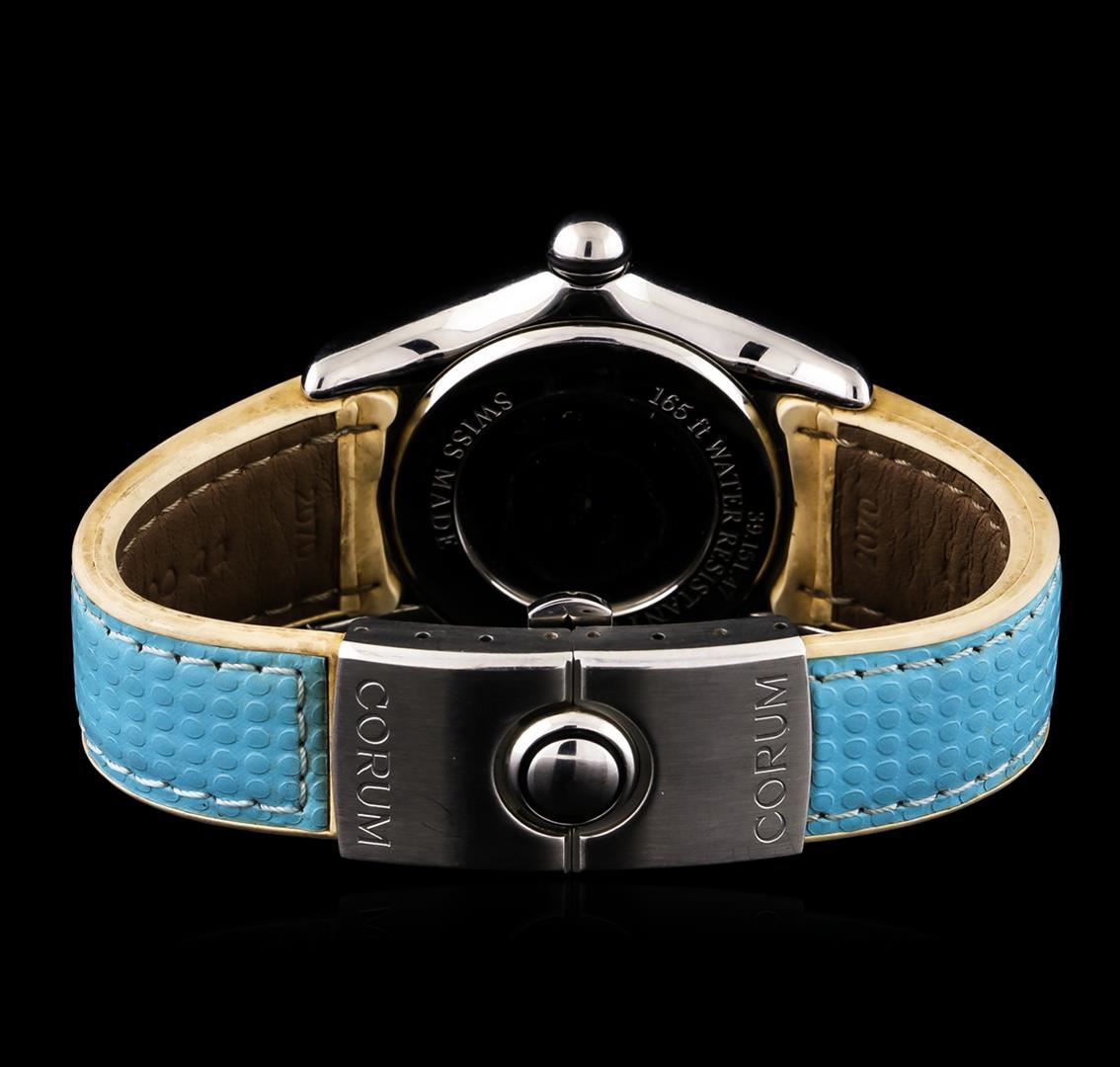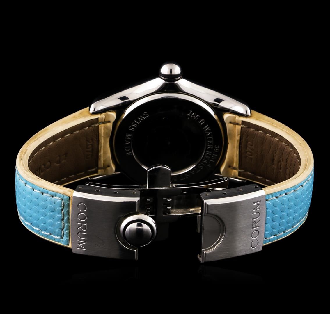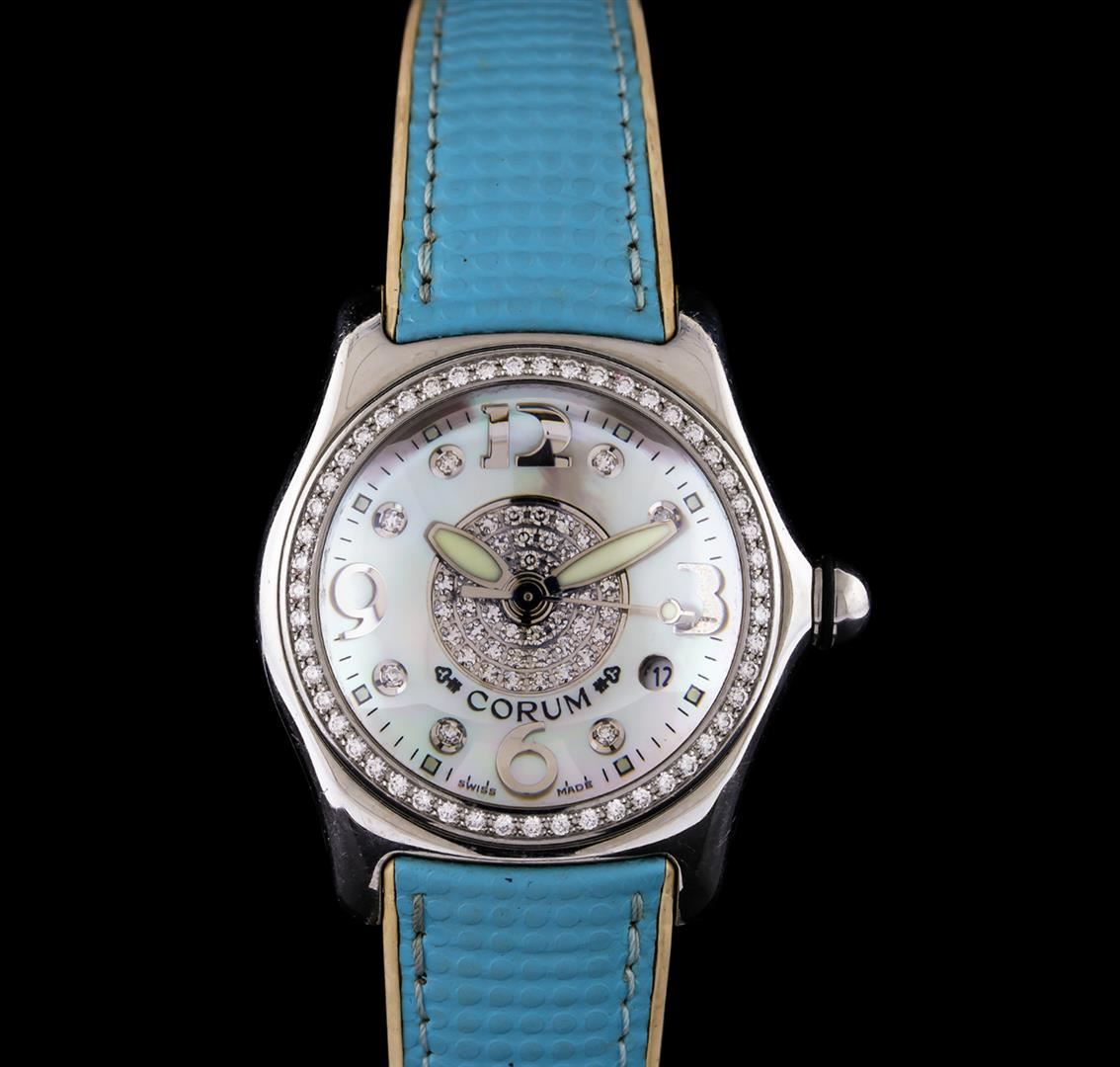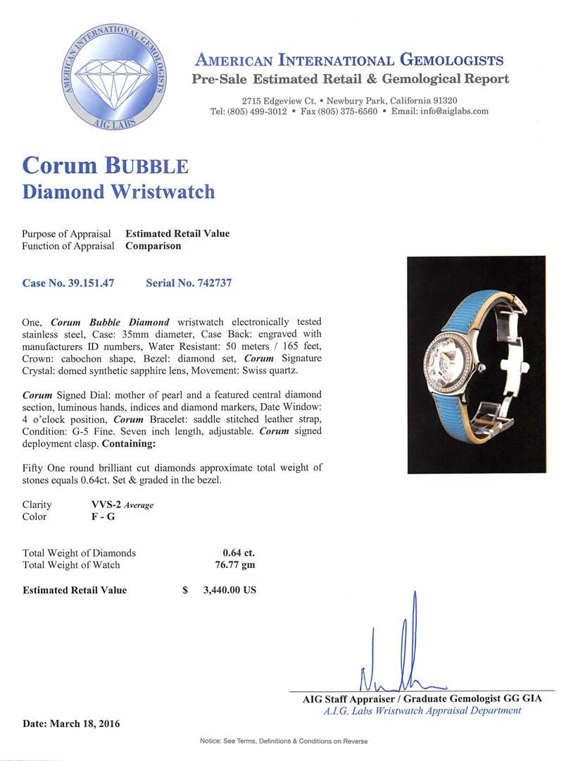 One, Corum Bubble Diamond wristwatch electronically tested stainless steel, Case: 35mm diameter, Case Back: engraved with manufacturers ID numbers, Water Resistant: 50 meters / 165 feet, Crown: cabochon shape, Bezel: diamond set, Corum Signature Crystal: domed synthetic sapphire lens, Movement: Swiss quartz. Corum Signed Dial: mother of pearl and a featured central diamond section, luminous hands, indices and diamond markers, Date Window: 4 o'clock position, Corum Bracelet: saddle stitched leather strap, Condition: G-5 Fine. Seven inch length, adjustable. Corum signed deployment clasp. Containing: Fifty One round brilliant cut diamonds approximate total weight of stones equals 0.64ct. Set & graded in the bezel. Clarity: VVS-2 Average. Color: F - G. Total Weight of Diamonds 0.64ct. Total Weight of Watch 76.77gm. AIG Appraised at $3,440.00.