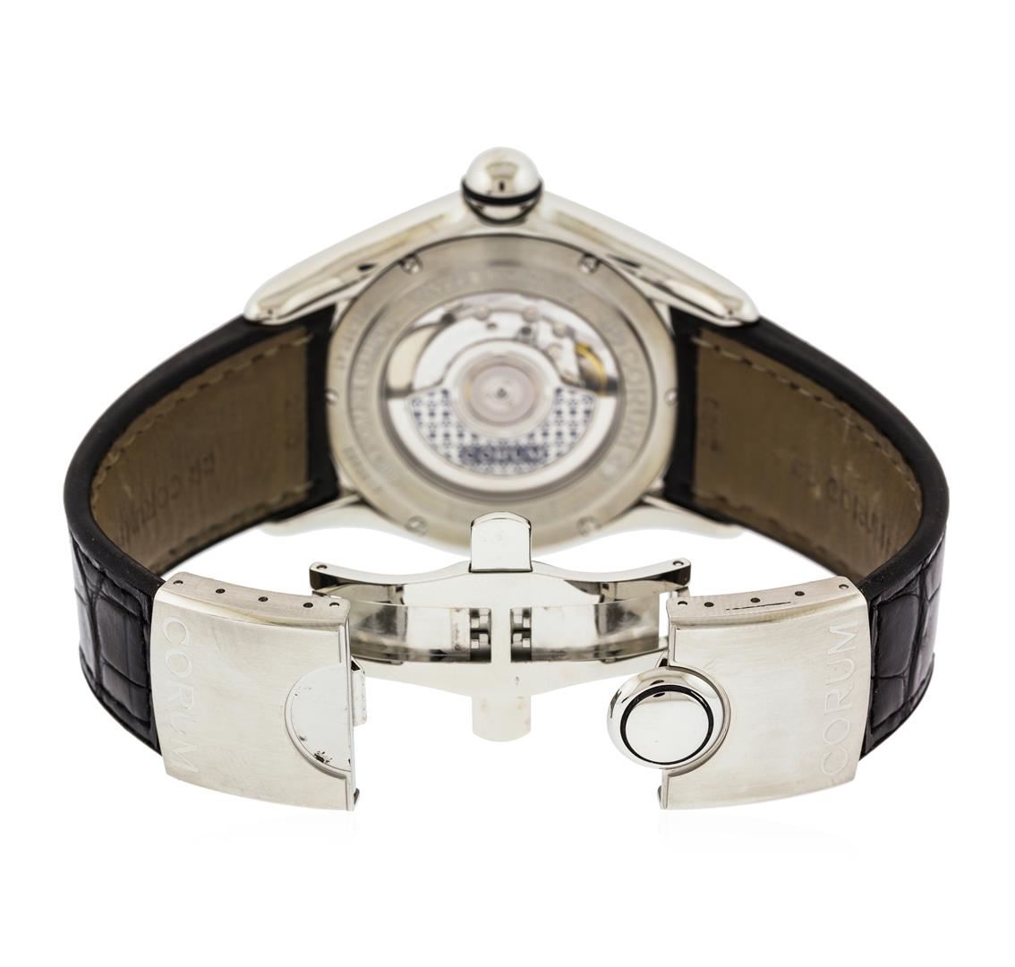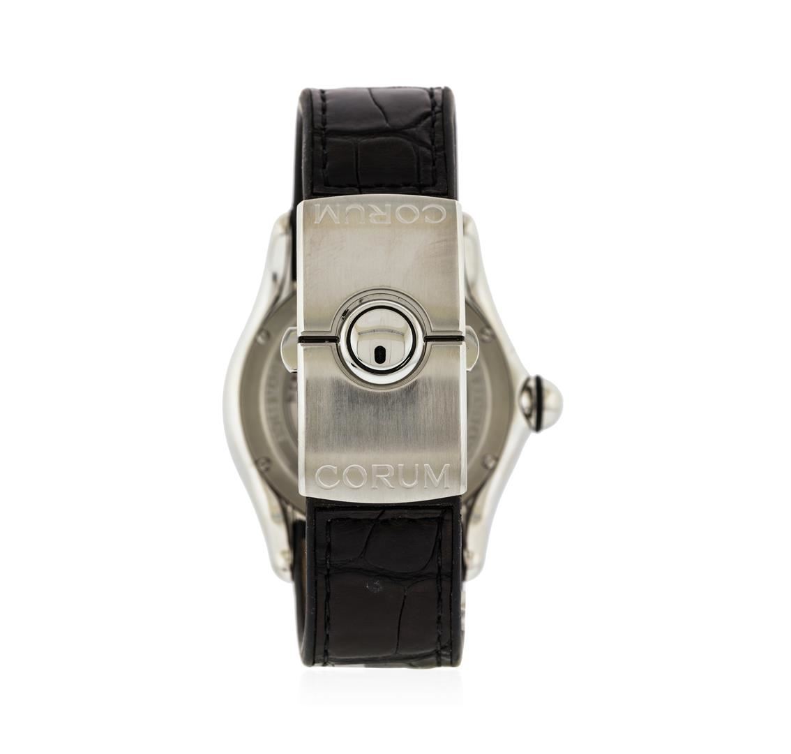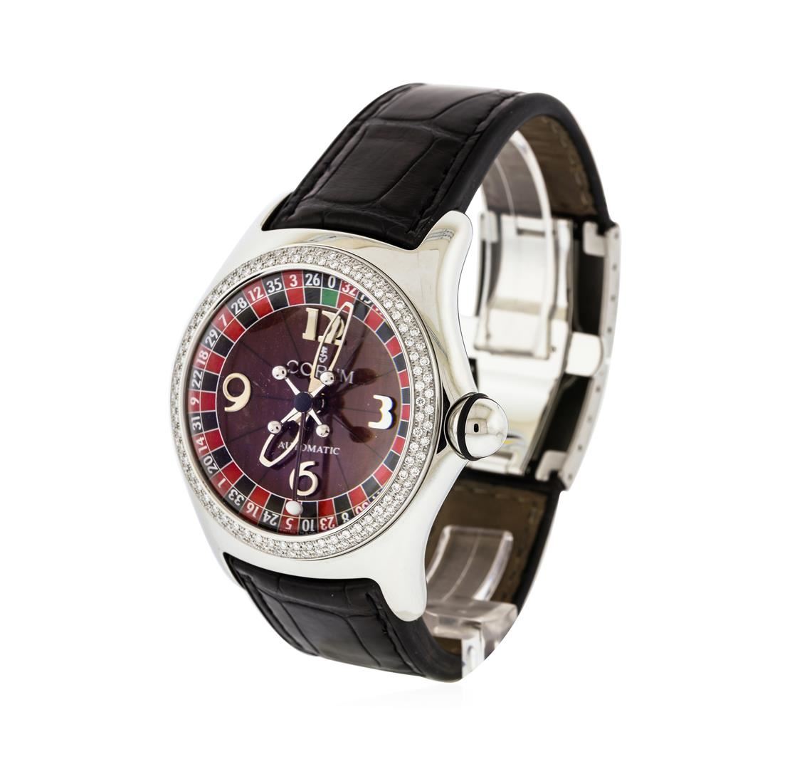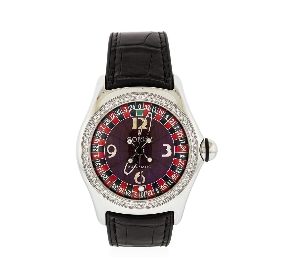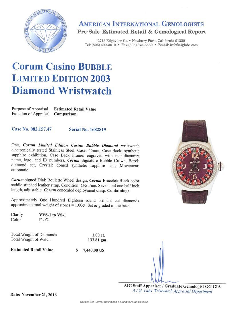 One, Corum Limited Edition Casino Bubble Diamond wristwatch electronically tested Stainless Steel. Case: 45mm, Case Back: synthetic sapphire exhibition, Case Back Frame: engraved with manufacturers name, logo, and ID numbers, Corum Signature Bubble Crown, Bezel: diamond set, Crystal: domed synthetic sapphire lens, Movement: automatic. Corum signed Dial: Roulette Wheel design, Corum Bracelet: Black color saddle stitched leather strap, Condition: G-5 Fine. Seven and one half inch length, adjustable. Corum concealed deployment clasp. Containing: Approximately One Hundred Eighteen round brilliant cut diamonds approximate total weight of stones = 1.00ct. Set & graded in the bezel. Clarity: VVS-1 to VS-1 Color F - G. Total Weight of Diamonds 1.00ct. Total Weight of Watch 133.81gm. AIG Appraised at $7,440.00.
