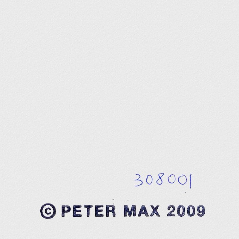 "Cosmic Flyer" is a hand signed one-of-a-kind acrylic mixed media on paper by Peter Max. The piece comes custom framed with a backside cutout to display Peter Max Studio registration number 308001 certifying authenticity. Measures approximately 26" x 23" (frame), 13" x 10" (image). This item requires special handling and may have a longer than usual turnaround.