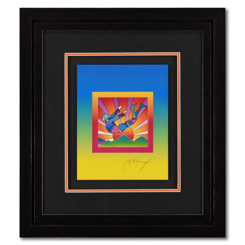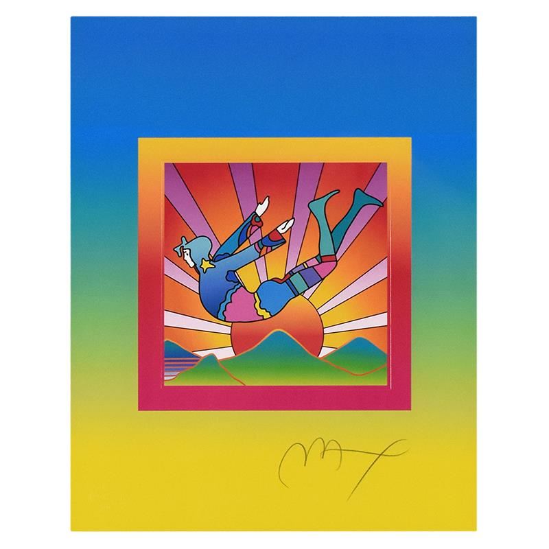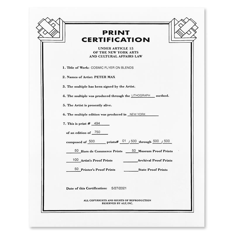 "Cosmic Flyer on Blends" is a limited edition lithograph on paper by Peter Max, numbered 494/500 and hand signed by the artist. This piece comes framed. Includes Certificate of Authenticity from Peter Max Studios. Measures approximately 22.5" x 25" (frame), 10" x 13" (image).